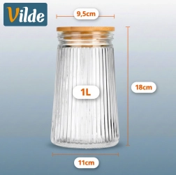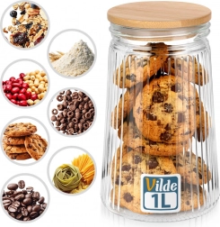 Stílusos, 1 l űrtartalmú üveg tároló bambusz fedéllel és szilikon tömítéssel, amely tovább frissen tartja az élelmiszereket. Az átlátszó, bordázott üvegnek köszönhetően mindig szem előtt van a tartalom, konyhája pedig rendezett és elegáns hatást kelt. Ideális kávé, édesség, tészta, müzli vagy más száraz élelmiszerek tárolására. Az ellenálló boroszilikát üveg és a légmentes zárás garantálja a frissességet és az aromát.