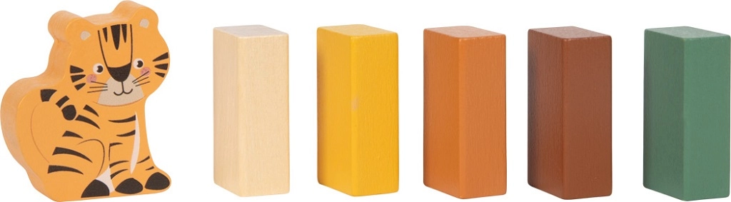 - Színes fa téglák, keret alappal, 2 fa pálca, kis tigris figura