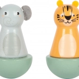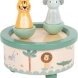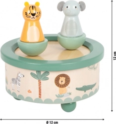 Ez a klasszikus zenélő doboz nyugodt hangulatot varázsol elalvás előtt, és örömöt nyújt játék közben. A két fa figura – a tigris és az elefánt – mágnesekkel rögzül a felső részen, lejátszás közben forognak, és könnyen levehetők önálló játékhoz. A minőségi lakkozás és a sima felületek kíméletesek a gyerekek kezeihez.