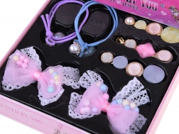 - Teljes tartozékkészlet: gyöngyök, medálok, fém karkötő, lánc, csíptetős fülbevalók, 2 gyűrű, rugalmas zsinór, csipesz, hajgumik, csatok, masnik