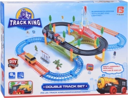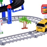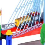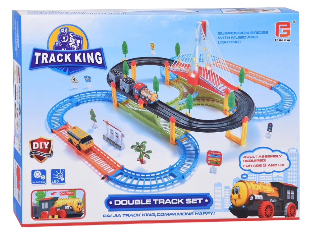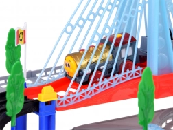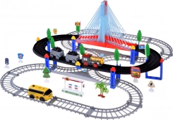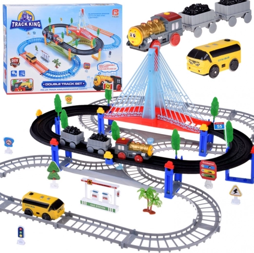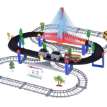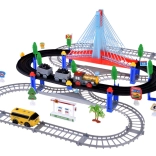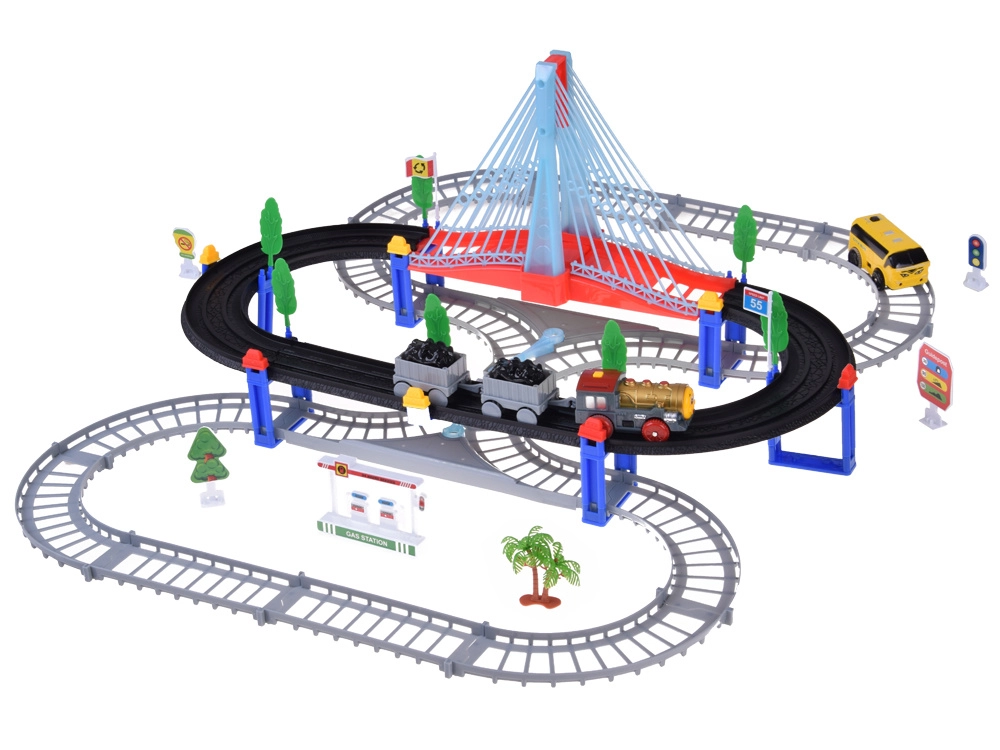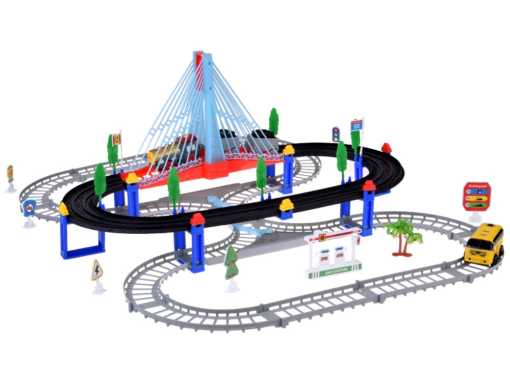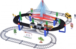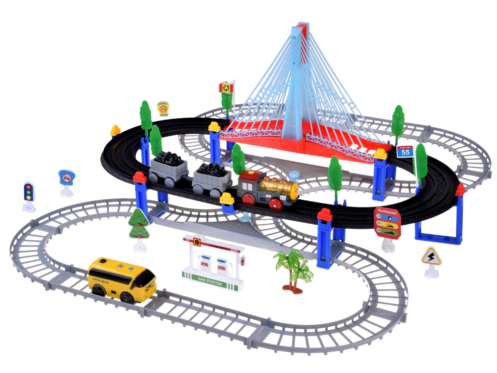 Ez az elektromos vasútpálya többszintű sínekkel és függőhíddal órákig tartó alkotó játékot kínál a gyerekeknek. A mozdony vagonokkal és a sárga városi busz összekapcsolt útvonalakon közlekednek, áthaladnak a hídon, és elmennek közlekedési táblák, fák és egy kis benzinkút mellett. A LED világítás és a mozdony hangjai, dallamokkal kiegészítve, még valósághűbbé teszik a játékot.