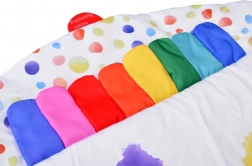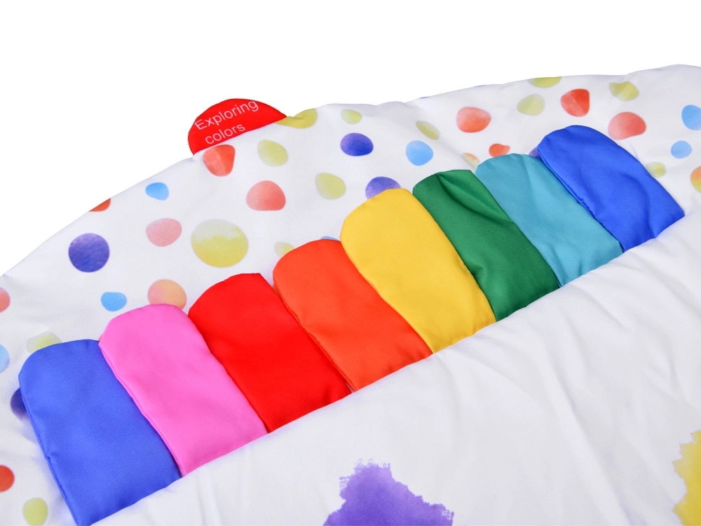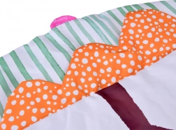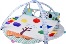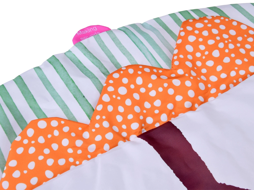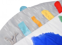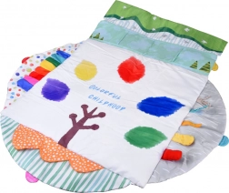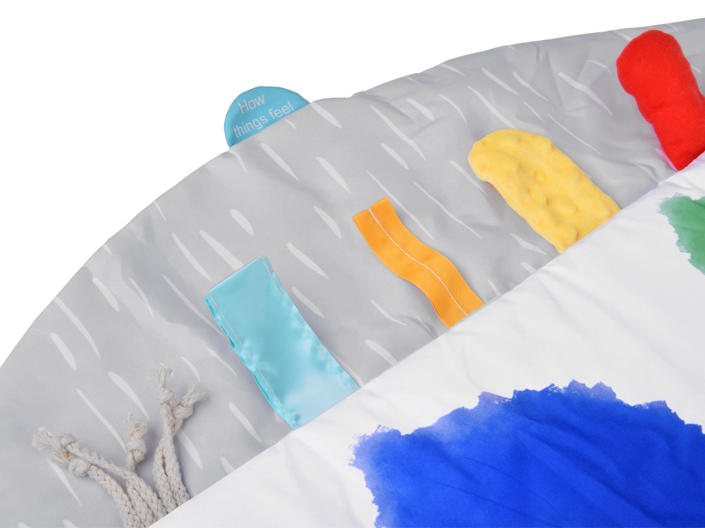 Ez a nagy, kör alakú bébi szőnyeg kényelmes, párnázott felületet és sokoldalú használatot kínál: játékszőnyeg ívekkel a felakasztható játékokhoz, vagy önálló szőnyegként a szabad játékhoz és a hason végzett gyakorláshoz. A minták erős kontrasztja, a változatos textúrák és a finom hangok természetes módon stimulálják az érzékeket, fejlesztik a finom- és nagymozgásokat.