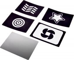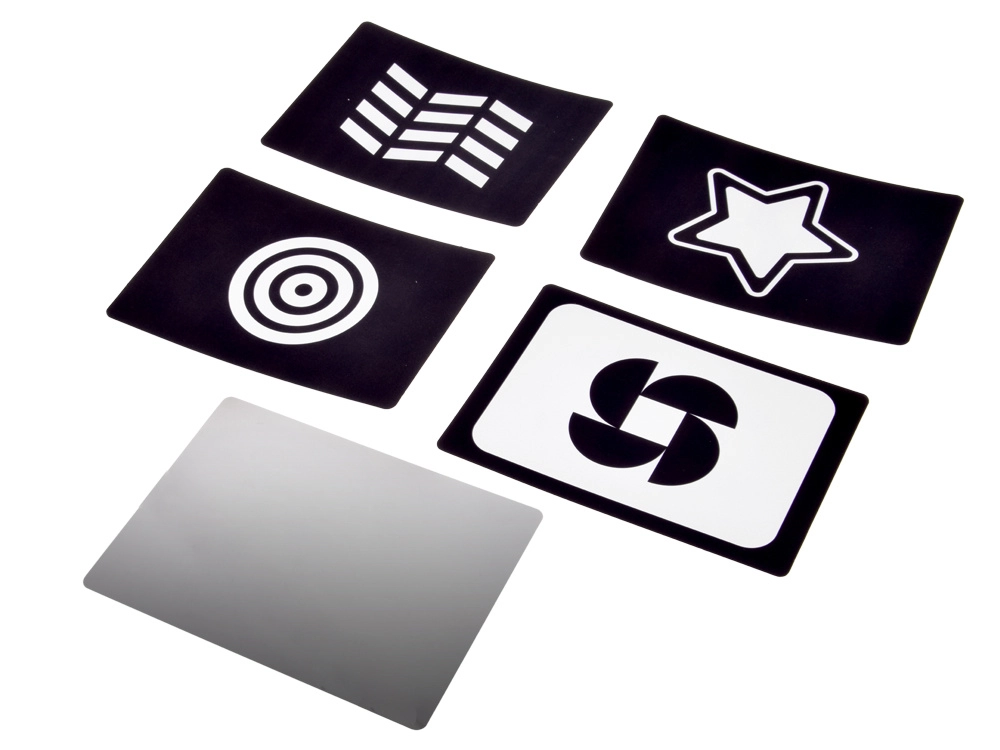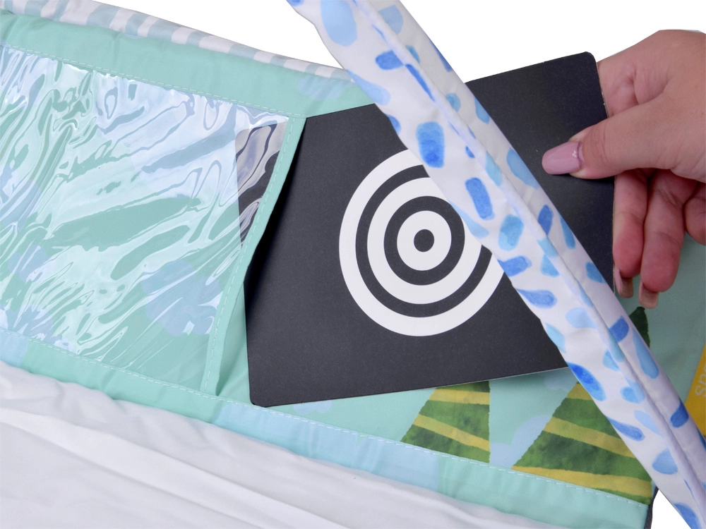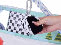 Erős kontraszt, különböző textúrák, zizegő és csörgő elemek támogatják a látást, a hallást és a tapintást. A tükör és a kártyák megfigyelésre és fókuszálásra ösztönzik a babát.