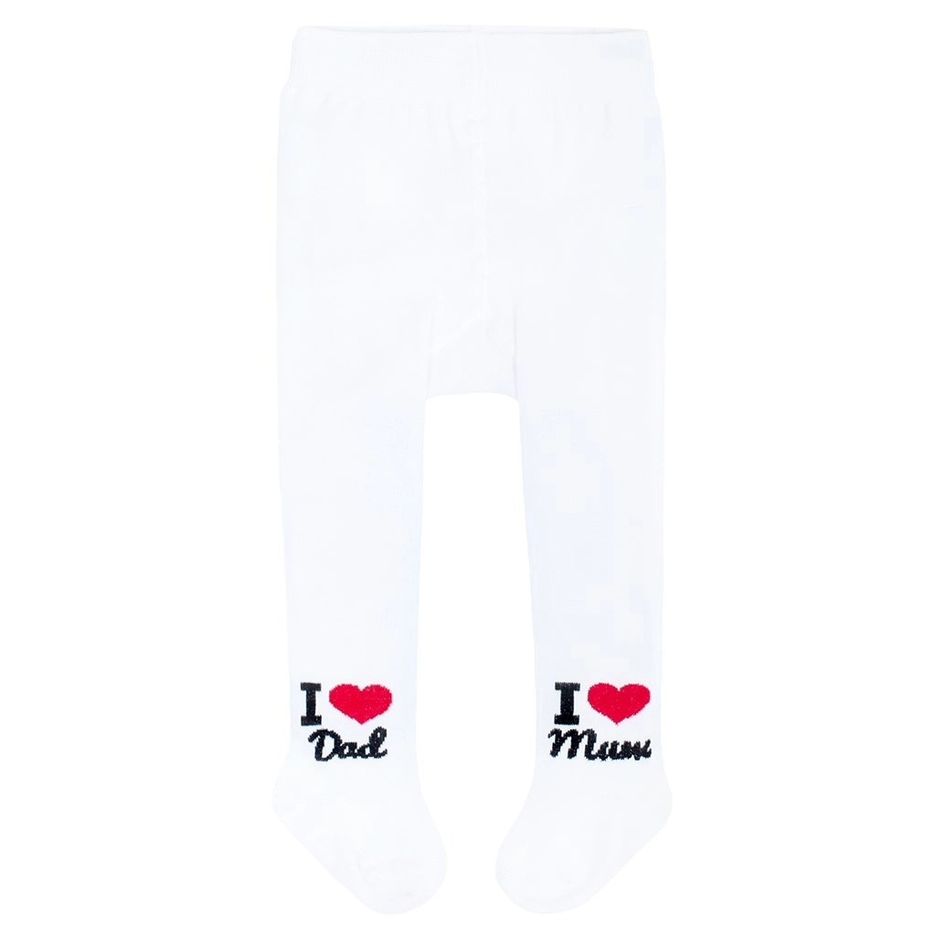 Aranyos New Baby gyerek harisnyanadrág kellemes pamutból, I Love Mum and Dad mintával, amely örömet szerez minden kis csibésznek és hercegnőnek. Puha, lélegző, és a minőségi kivitelezésnek köszönhetően tartja a formáját és a színeit. Remek választás mindennapi viseletre és ajándéknak friss szülőknek.