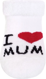 Kényelmes bébi frottír zokni a New Baby-től, bájos I Love Mum and Dad motívummal, mely lenyűgöz a nyomásmentes rugalmas passzéval és a meleg frottír anyaggal, hűvösebb napokra ideális. A minőségi kivitel megőrzi a formát és a színeket gyakori mosás után is.