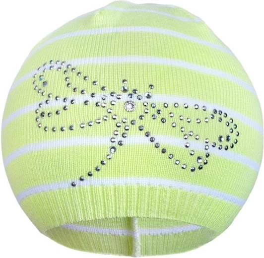 Könnyű tavaszi New Baby sapka szitakötő mintával, ideális a hűvösebb tavaszi és őszi napokra. Lélegző, 100% pamutból készült, rugalmas és kellemes viselet. A díszítő csillogó kövek stílusos megjelenést adnak, kerület kb. 42–46 cm, 3–4 éves gyermekeknek.