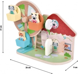 Ez a színes small foot motorikus játék kis élményközponttá varázsolja a gyerekszobát. A gyerekek imádni fogják az óriáskerék forgatását a simán futó tekerővel, a fa állatfigurák kabinokba ültetését és a színes ajtók mögötti minták felfedezését. A játék természetes módon fejleszti a finommotorikát, a kéz–szem koordinációt és a logikus gondolkodást, miközben támogatja a képzeletet és az önálló felfedezést.