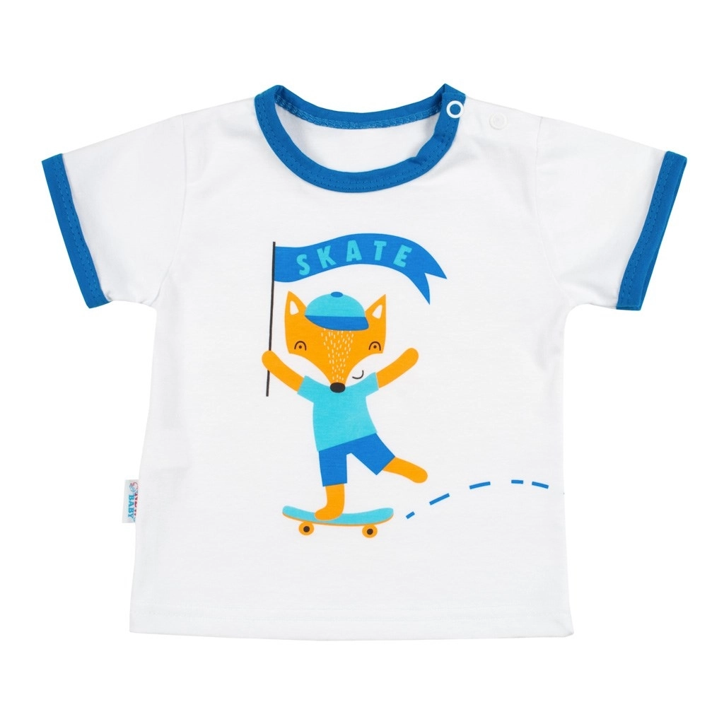 Aranyos, 2 részes baba szett puha, 100% pamutból: rövid ujjú póló gördeszkázó rókás mintával és SKATE felirattal, valamint egyszínű rövidnadrág kényelmes gumis derékkal. Könnyű öltöztetés a vállon lévő patentoknak köszönhetően, kellemes anyag az érzékeny bőrnek, ideális választás nyárra.