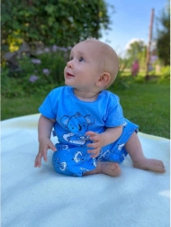 Ez a két részes szett ideális a meleg napokra és a nyugodt alváshoz. A vállon patentos záródású póló gyors és kényelmes öltöztetést tesz lehetővé, míg a légáteresztő pamut egész nap maximális komfortot biztosít. A rövidnadrág puha, rugalmas dereka nem szorít, és alkalmazkodik a kisbaba pocakjához.