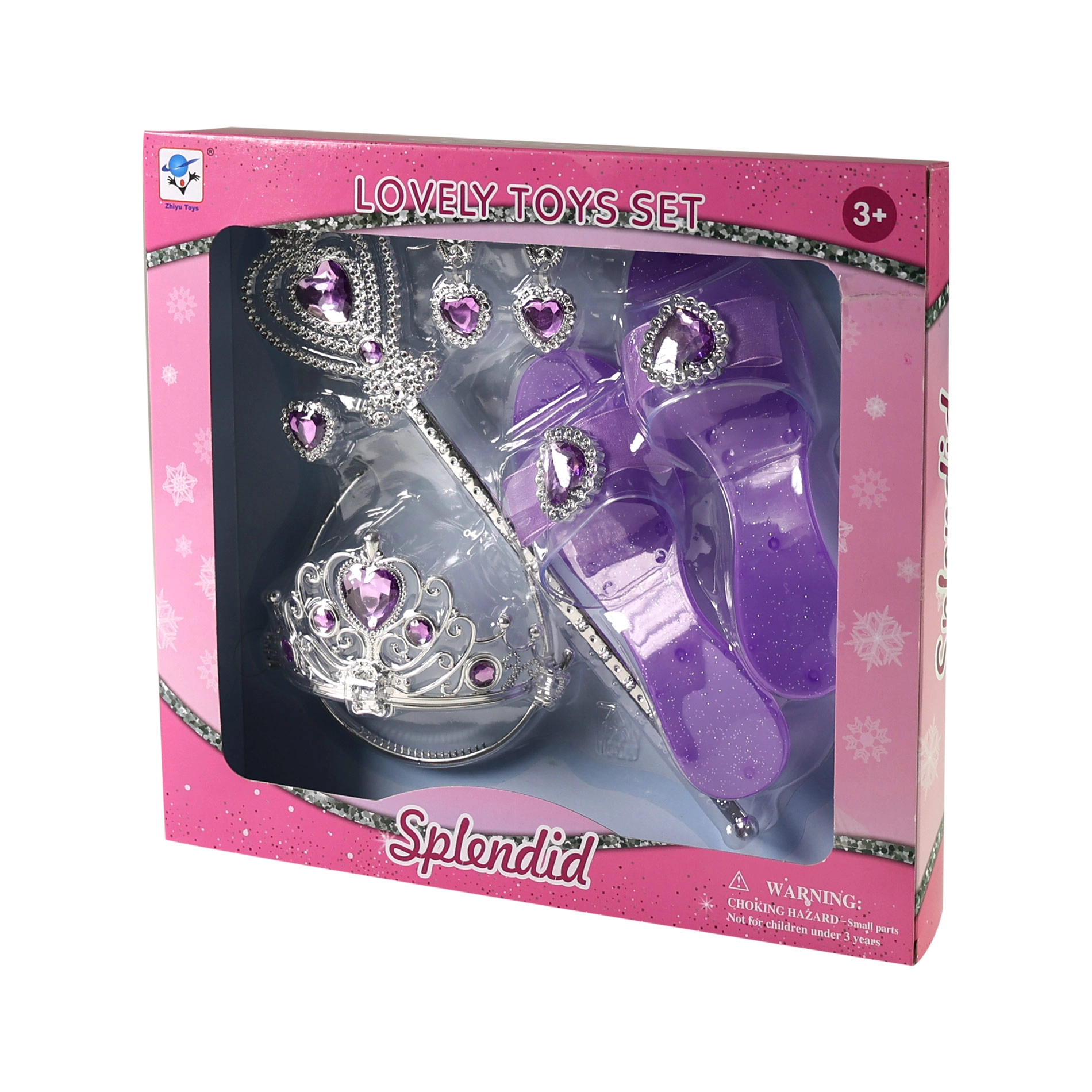 Változtasson minden délutánt mesés kalanddá ezzel a stílusos, gyerekeknek szánt hercegnős készlettel. A szett tartalmaz lila cipellőket, ezüst koronát lila kövecskékkel, varázspálcát, fülbevalót és gyűrűt – mind tökéletesen összehangolva jelmezes játékhoz, farsangra és ünnepekre.
