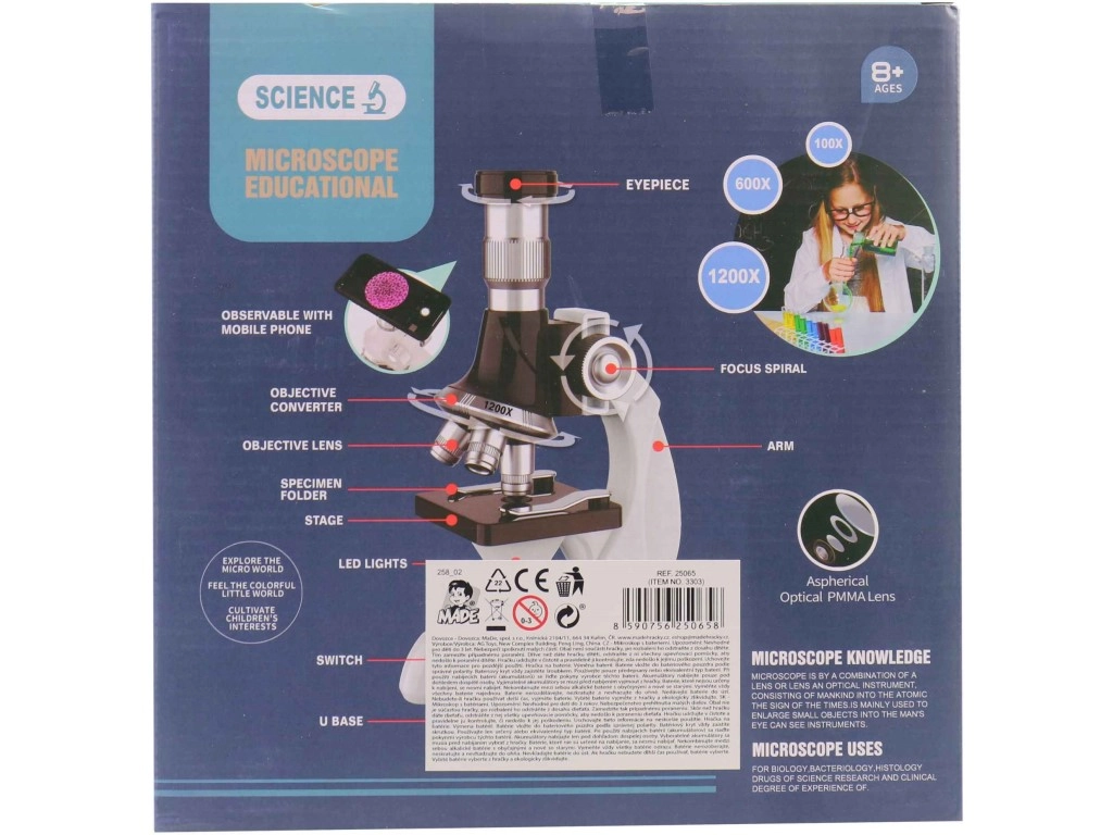 Ez a gyermekmikroszkóp remek választás az első lépésekhez a tudomány világában. Könnyű műanyag felépítésének köszönhetően egyszerűen hordozható, otthonra és iskolába egyaránt alkalmas. A praktikus megfigyelő „ablakok” megkönnyítik a minták követését, és segítenek a gyerekeknek megérteni a mikroszkópia alapjait.