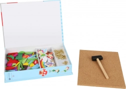 Az elemek előre fúrt lyukakkal rendelkeznek, így a szegeket könnyű beütni. A fa kalapács jól illik a gyerekek kezébe, a parafának köszönhetően a munka halk és stabil.