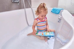 Könnyű kialakítása a víz felszínén lebeg, biztonságos a kádba és a medencébe. A gyerekek könnyen lapozgatnak, miközben felfedezik a színeket és formákat.