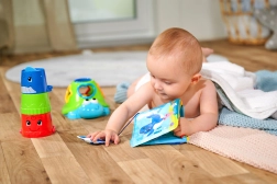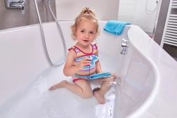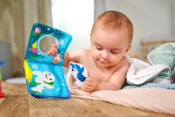 Tartozik hozzá egy mókás sípoló függő, amely ösztönzi a nyomogatást, erősíti a finommotorikát és örömteli hangfelfedezést kínál. A könyvecske a víz felszínén lebeg, így a kicsik közvetlenül fürdés közben nézegethetik.