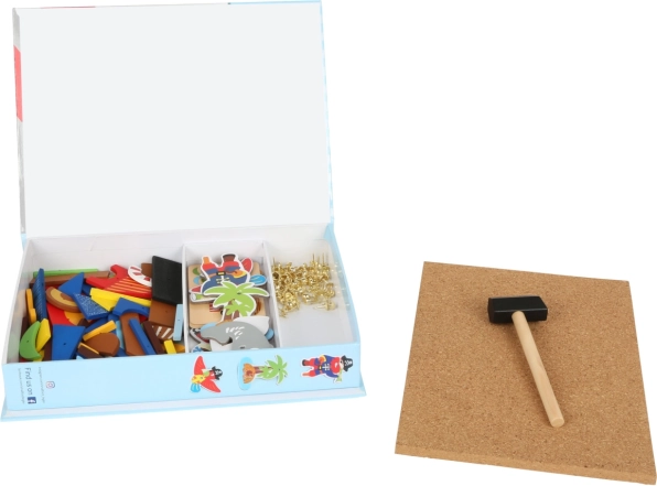 - kalóz motívumú faelemek, arany színű rajzszögek, rugalmas parafatábla, fa kalapács, 4 kétoldalas mintakártya, tárolódoboz