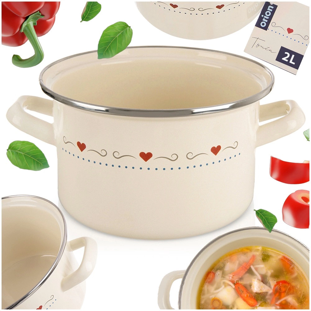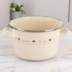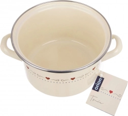 Elegáns, 2 l űrtartalmú zománcozott lábas finom szívecskés motívummal, krémszínben. Alkalmas minden típusú tűzhelyhez, beleértve az indukciósat is, valamint sütőbe is tehető. A ergonomikus fogantyúknak köszönhetően kényelmesen hordozható, és mosogatógépben mosható. Az egészségkímélő zománcozott acél allergiások számára is biztonságos.