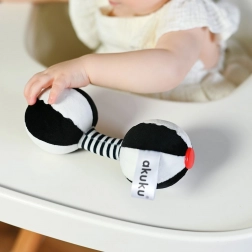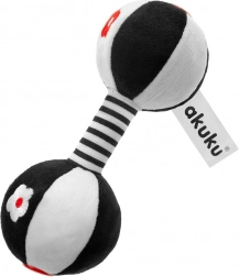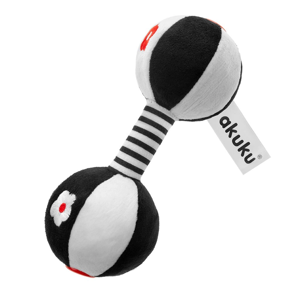 Puha, súlyzó alakú szensoros játék az Akuku márkától, amely már újszülött kortól örömet szerez a babáknak. A kontrasztos színek stimulálják a látást, a beépített csengők támogatják a hallást, a finom plüss pedig fejleszti a tapintást és a motorikát.