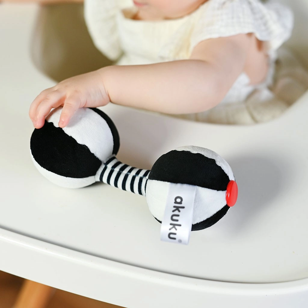 Ez a kontrasztos, súlyzó formájú játék kellemes, plüss anyagból készült, amely kíméletes az érzékeny bababőrhöz. A fekete-fehér kontrasztos elemek felkeltik a baba figyelmét és már az első napoktól támogatják a vizuális észlelést. Belül finom csengők találhatók, amelyek mozgásra hangot adnak, és segítik a hallási ingerek fejlődését.