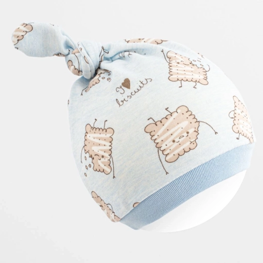 Aranyos újszülött sapka, a New Baby Biscuits modell csomócskával és teljes felületű kekszmintás nyomattal, amely örömet okoz a mindennapi viselet során. 100% pamutból készült, széles, nem szorító passzéval rendelkezik, és puha tapintású még a baba érzékeny bőréhez is. Remekül illeszkedik a fejecskére, és tökéletesen passzol a Biscuits kollekció ruháihoz.
