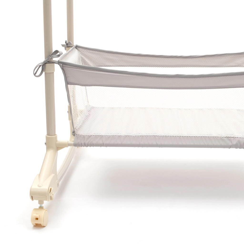 A praktikus és biztonságos 2 az 1-ben NEW BABY bölcső egyesíti a kiságy és a bölcső funkcióját. Mobilitásának köszönhetően a baba mindig ön mellett lehet, míg az állítható magasság, a levehető napellenző és a forgó éjszakai fénnyel, zenével és rezgéssel kényelmet és nyugodt alvást biztosít. A huzat lélegző és mosható, továbbá praktikus tárolókosár és rögzíthető kerekek segítik a könnyű áthelyezést.