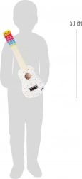 Ez a könnyű és strapabíró fa gitár a kis zenészeknek készült. Kompakt méreteinek köszönhetően kényelmesen tartható a gyerekkezekben, és segíti a koordináció, a ritmus és a zenei érzék fejlesztését. Vidám, pöttyös dizájnja első pillantásra magával ragad, és motivál a játékra.