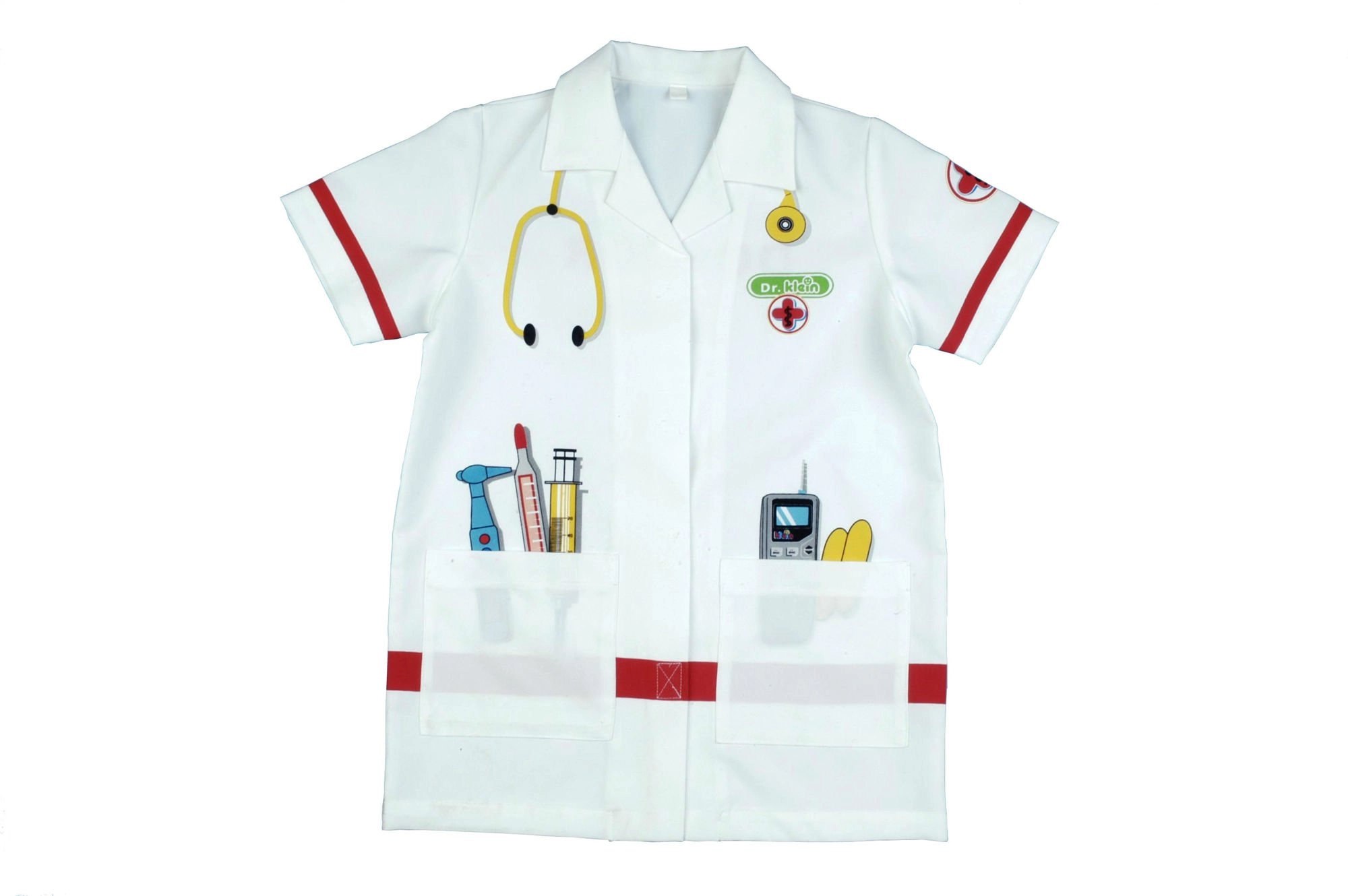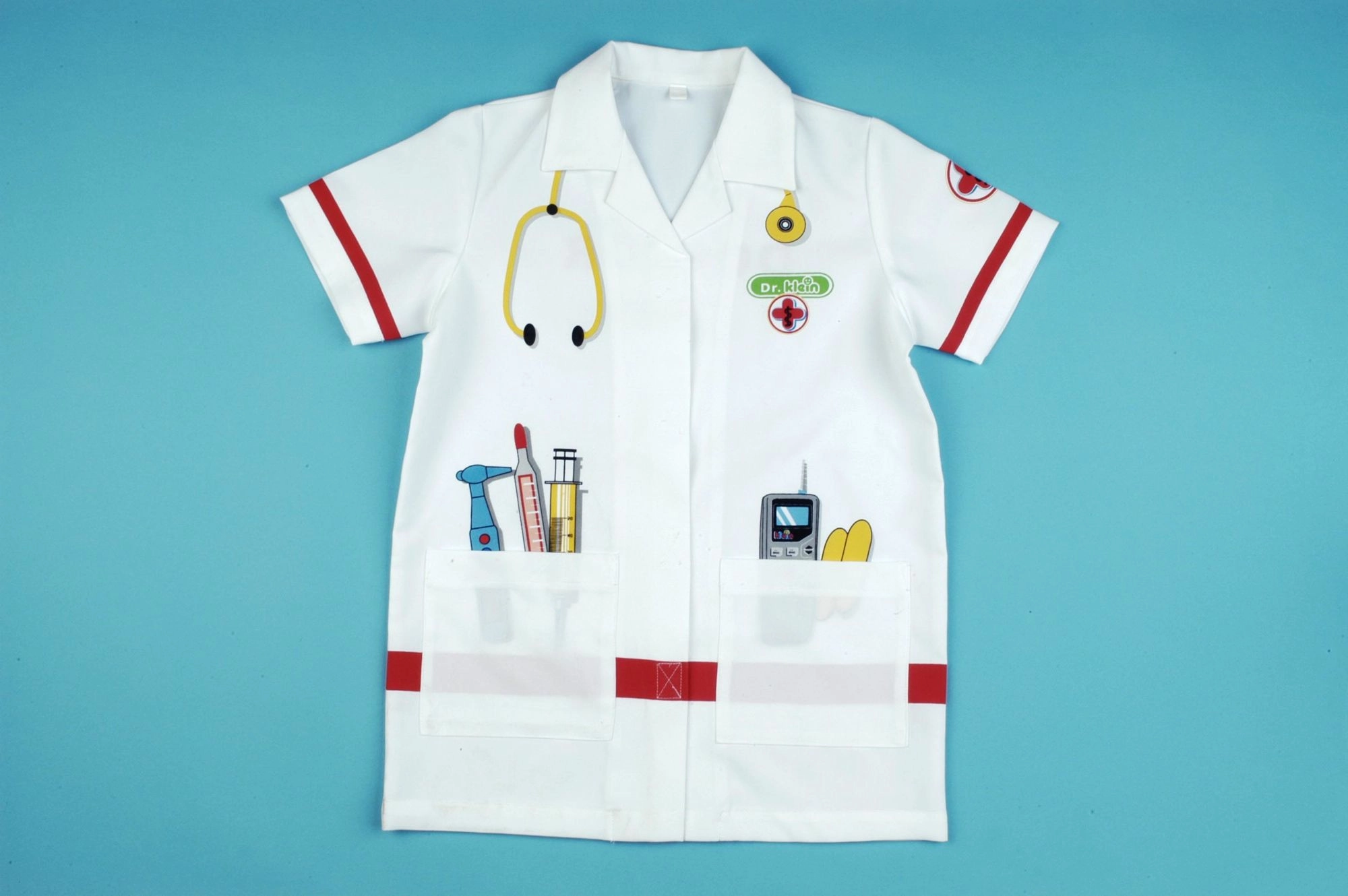 Stílusos gyerek orvosi köpeny a KLEIN márkától 3–5 éves kis doktoroknak és doktornőknek. Könnyű 100% poliészter anyagból, rövid ujjakkal, tépőzáras záródással és két praktikus zsebbel. A fehér köpenyt színes orvosi eszközök nyomatai díszítik, mint sztetoszkóp, hőmérő és fecskendő – ideális a szerepjátékhoz és jelmezes játékhoz.