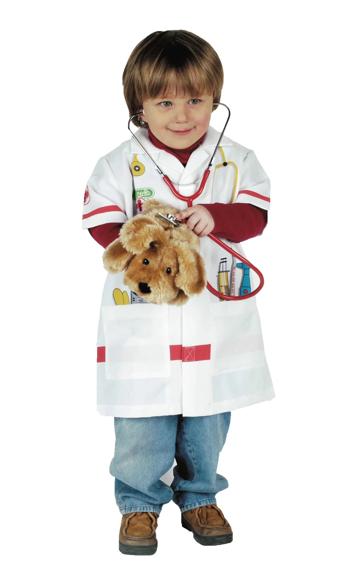 A sztetoszkóp, hőmérő, fecskendő és egyéb motívumok támogatják a valósághű orvosos játékot és fejlesztik a gyerekek fantáziáját.