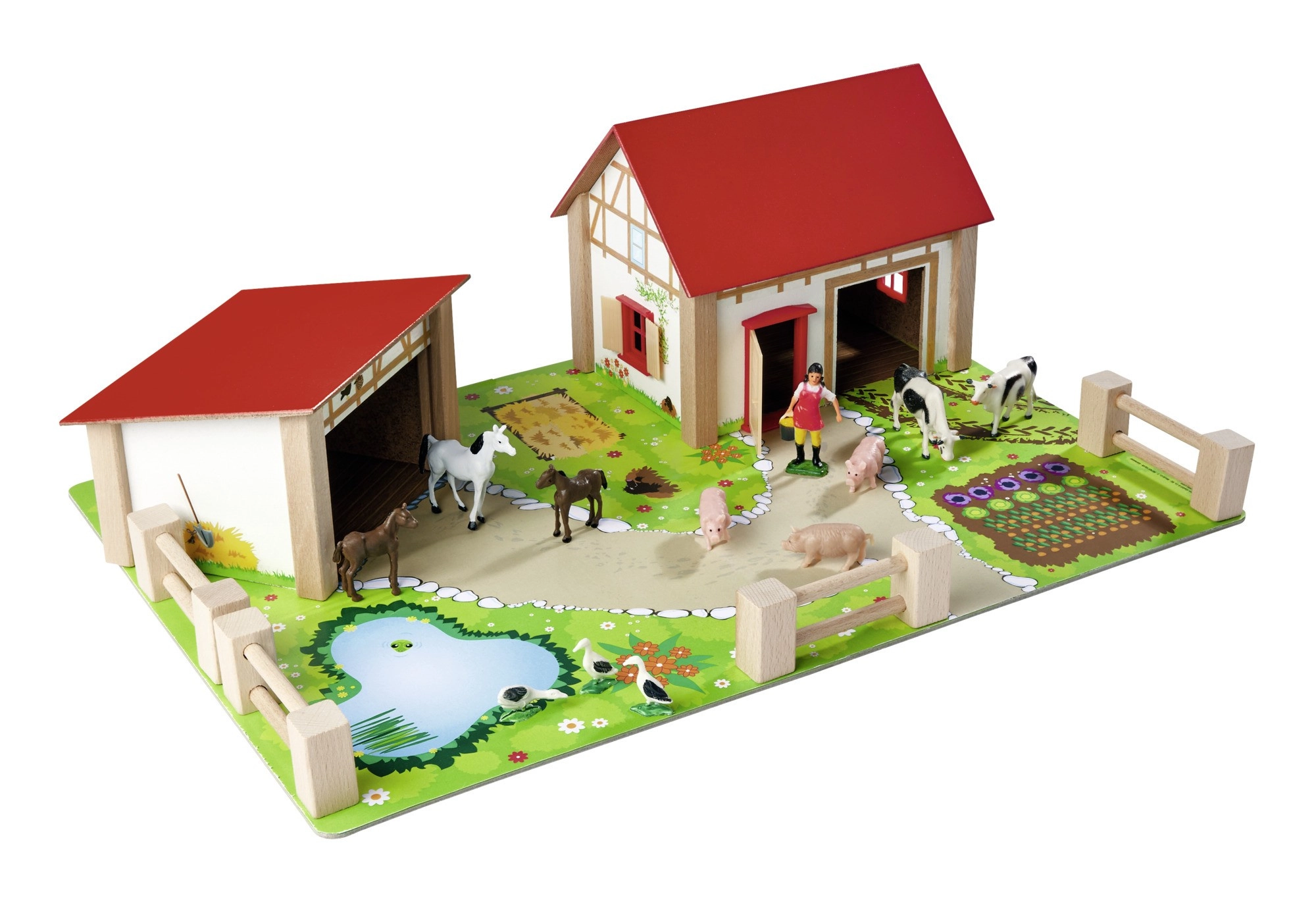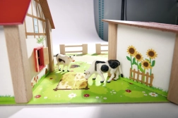 A készlet része egy nagy ház kifutóval és istállóval, színes alap 51 × 36 cm, kerítések és 12 figura állatokkal és egy farmer figurával. A játék támogatja a koordinációt, a színek és formák tanulását, valamint a háziállatok megismerését.