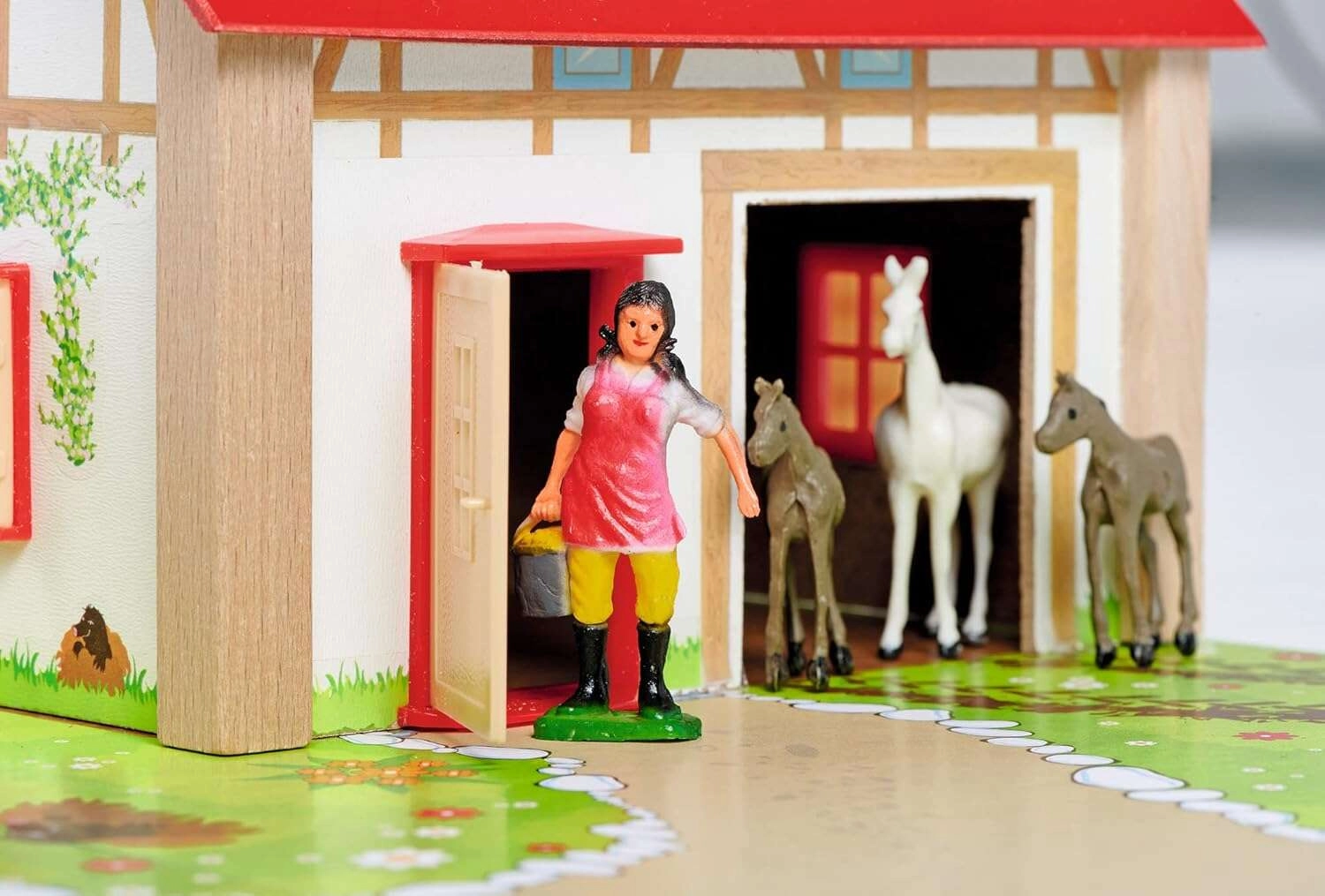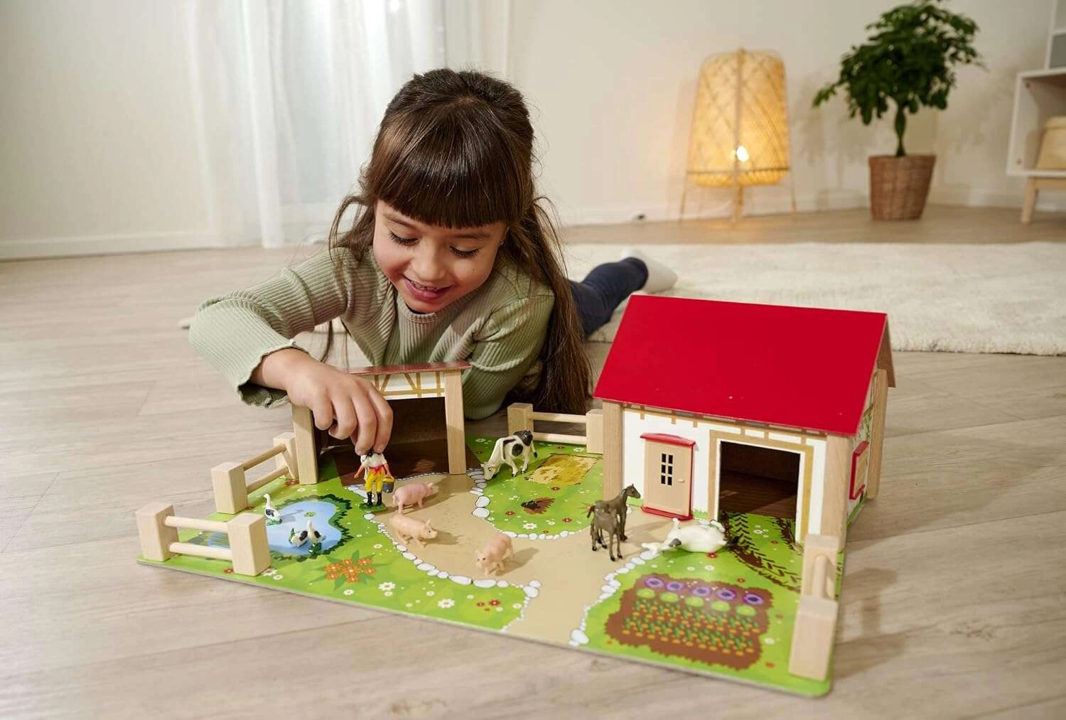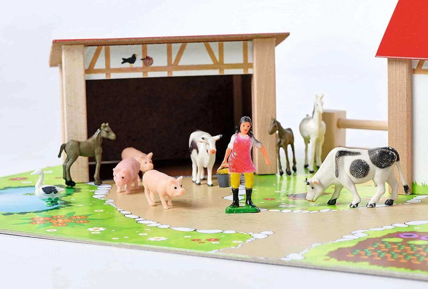 Nagy pajta istállóval, nyitható átjárókkal és karámokkal autentikus környezetet teremt. A gyerekek etethetik az állatokat, kivezethetik a kifutókba, és megszervezhetik a farm életét.