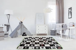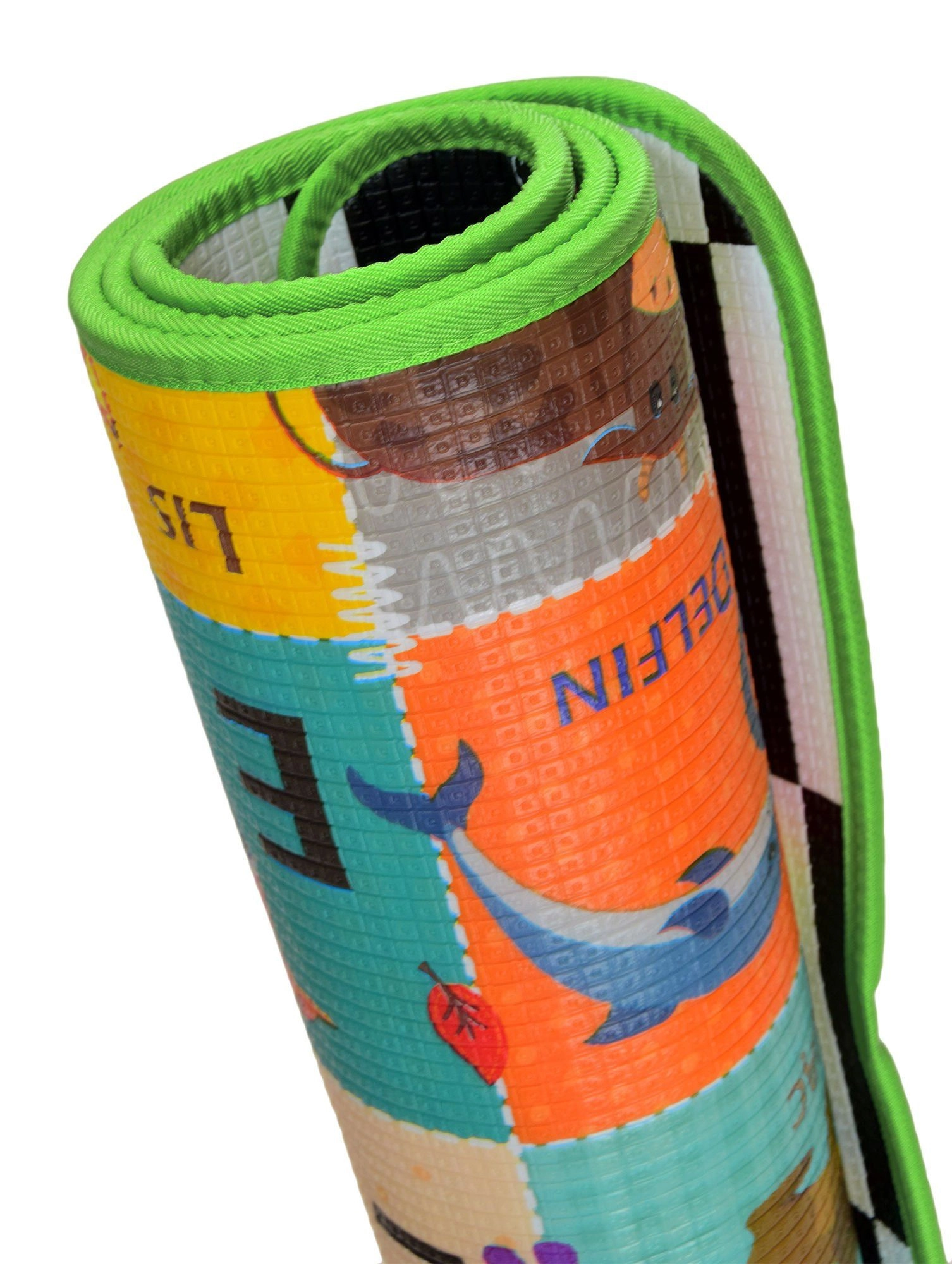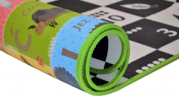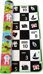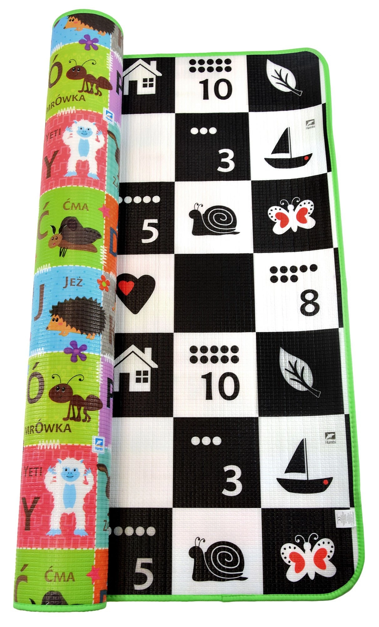 A kétoldalas minta együtt nő a gyermekkel: a kontrasztos fekete–fehér sakktábla egyszerű ikonokkal és számokkal, pöttyökkel a számoláshoz stimulálja a csecsemők látását, a színes oldal ábécével és állatokkal motivál a betűk tanulására. A szőnyeget könnyen feltekerheted, és az alaptartozék szállítótáskába teheted cipzárral – ideális otthonra, kertbe és utazáshoz.