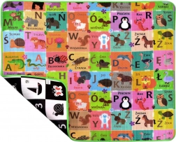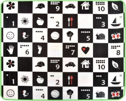 Az egyik oldal markáns fekete–fehér sakktáblát kínál számokkal és pöttyökkel az első számoláshoz, a másik pedig színes ábécét állatokkal a betűk játékos megismeréséhez.