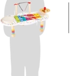 A xilofon, a dob, a triangulum és a cin áttekinthetően egy stabil asztalkán helyezkedik el, hogy a gyerekek könnyedén próbálgathassák a különböző hangokat és ritmusokat.