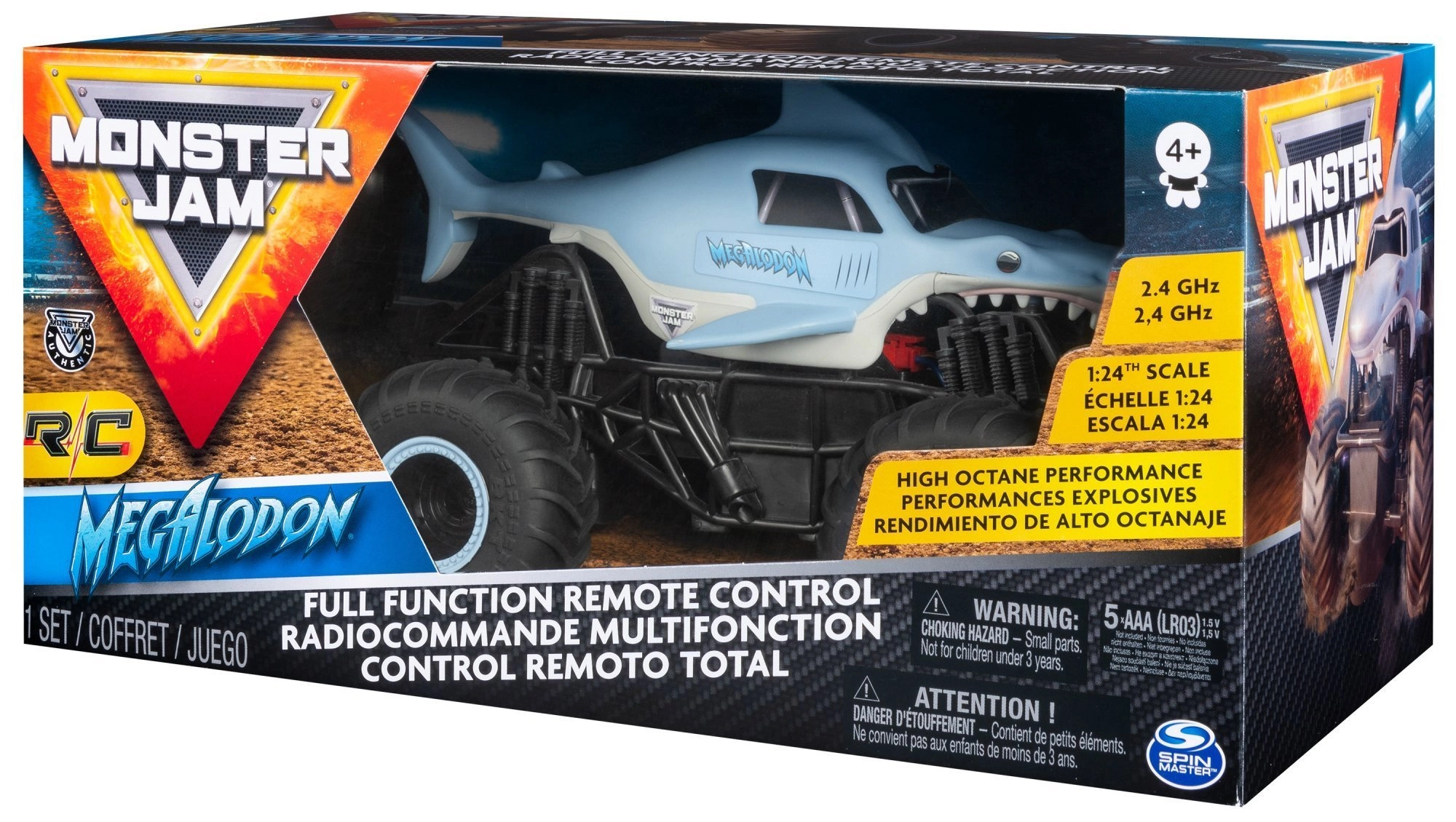 A licencelt MONSTER JAM Megalodon RC autó az ikonikus monster truck autentikus megjelenését hozza kék, cápastílusú karosszériával, uszonyokkal és fogakkal. A 1:24 méretarány ideális otthoni versenyzéshez és első RC élményekhez.