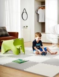 A HUMBI habszivacs szőnyeg biztonságos és kényelmes helyet teremt a babáknak és a nagyobb gyerekeknek. Az 1 cm vastagságnak köszönhetően kiválóan szigetel a hideg padlótól, és csillapítja az eséseket. A semleges szürke szín illik bármely enteriőrhöz, a moduláris puzzle szélek pedig lehetővé teszik a térhez igazított alakzat kialakítását.