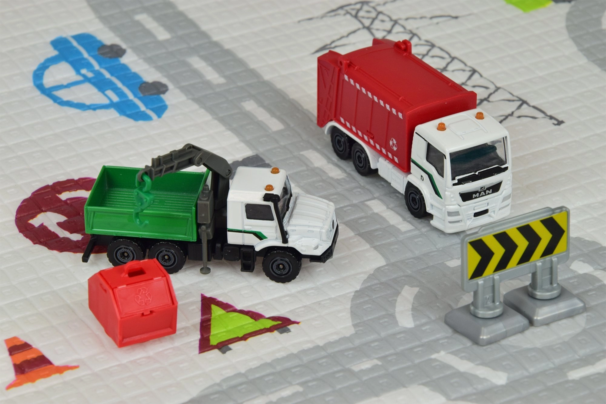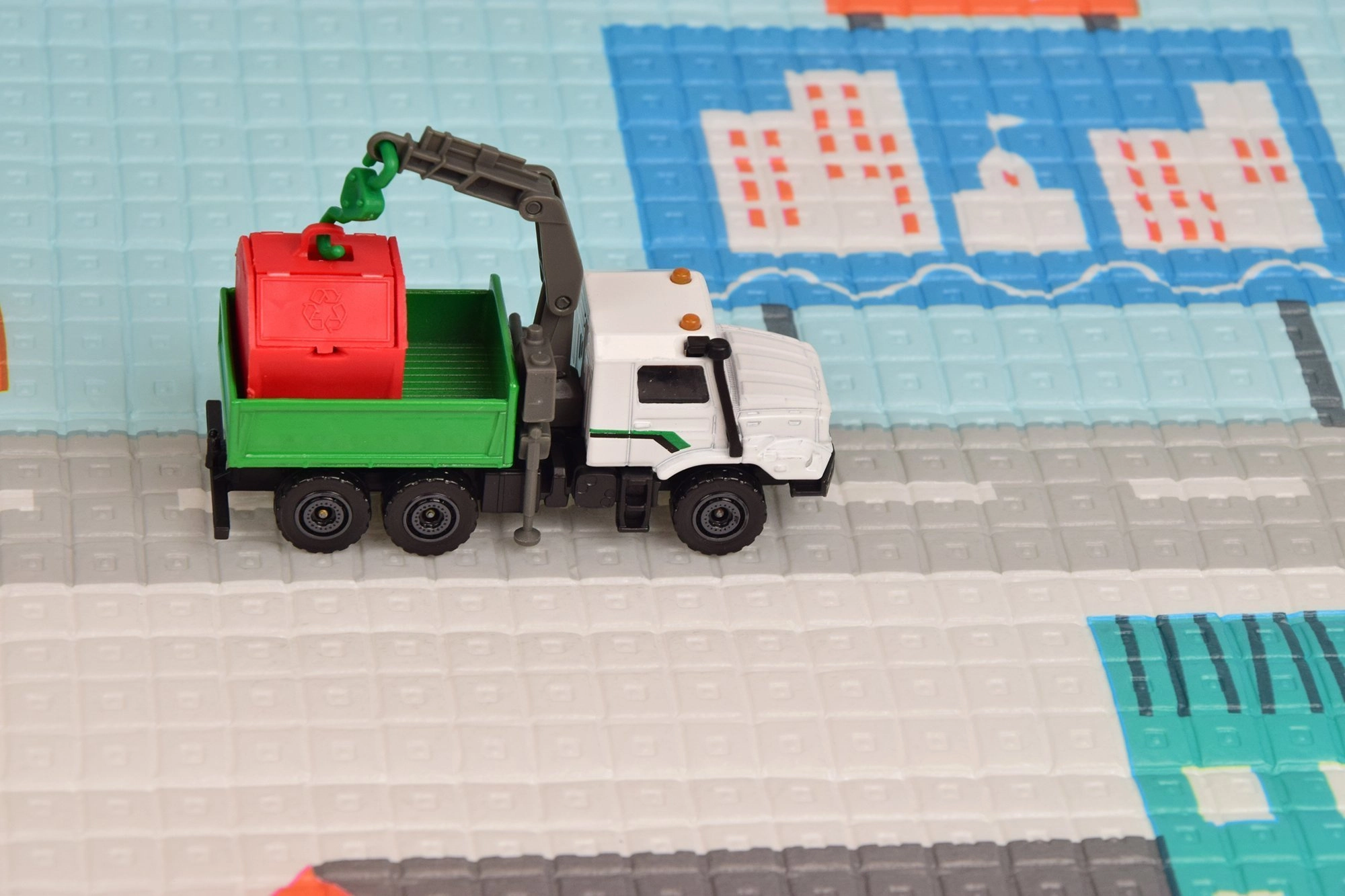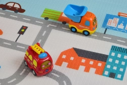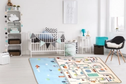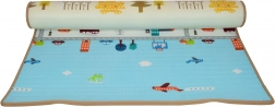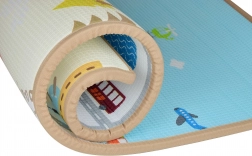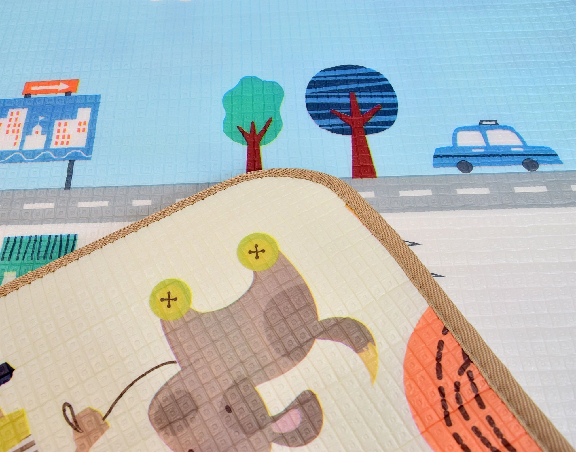 Az egyik oldal városi utcás mintával serkenti az autózás kreatív játékát, a másik oldal aranyos állatkái fejlesztik a fantáziát és nyugodt hangulatot teremtenek.