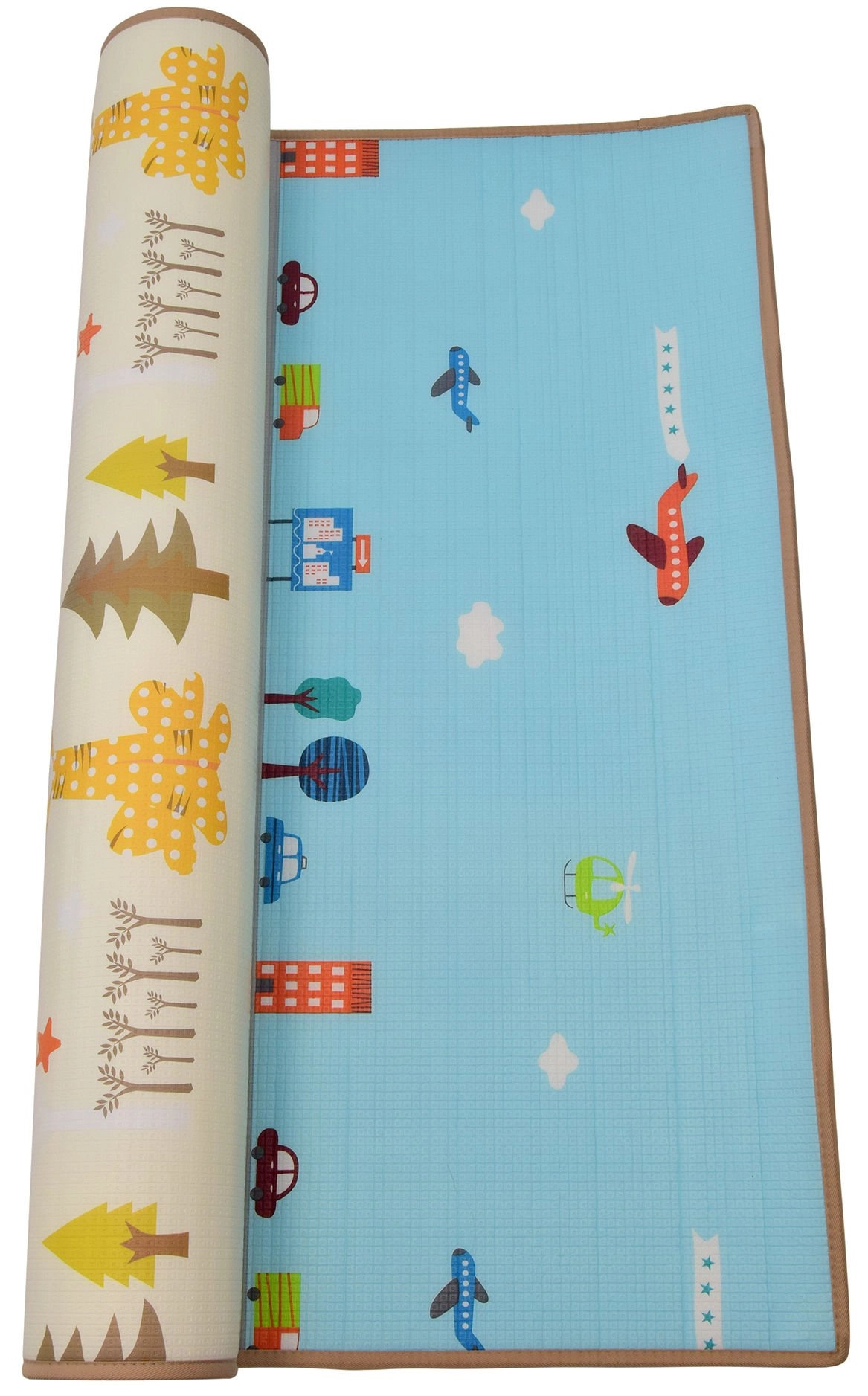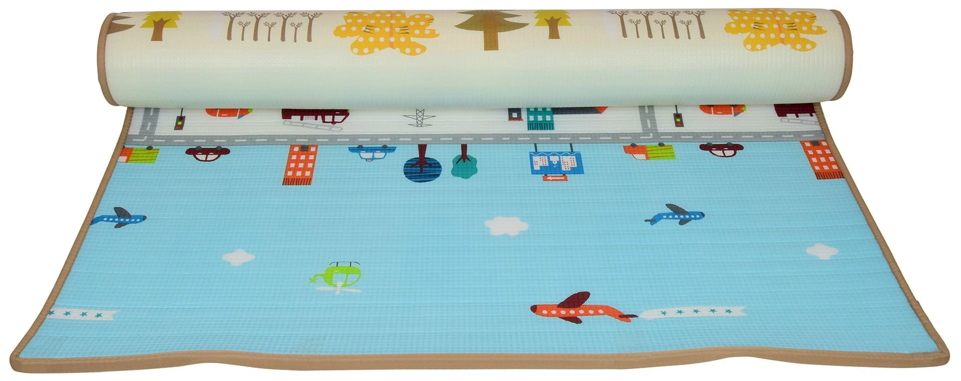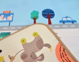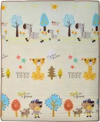 Mindkét oldalt fejlesztő minták díszítik: az egyik oldalon város utcácskákkal az autózáshoz, a másikon állatkák bézs alapon. Nem tartalmaz formamidot, ftalátokat, PVC-t és BPA-t, megfelel az EN71-1/2/3 és a REACH követelményeinek, valamint rendelkezik CE jelöléssel.