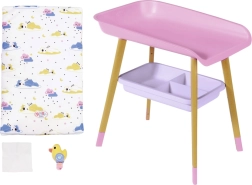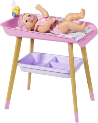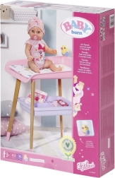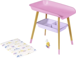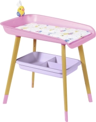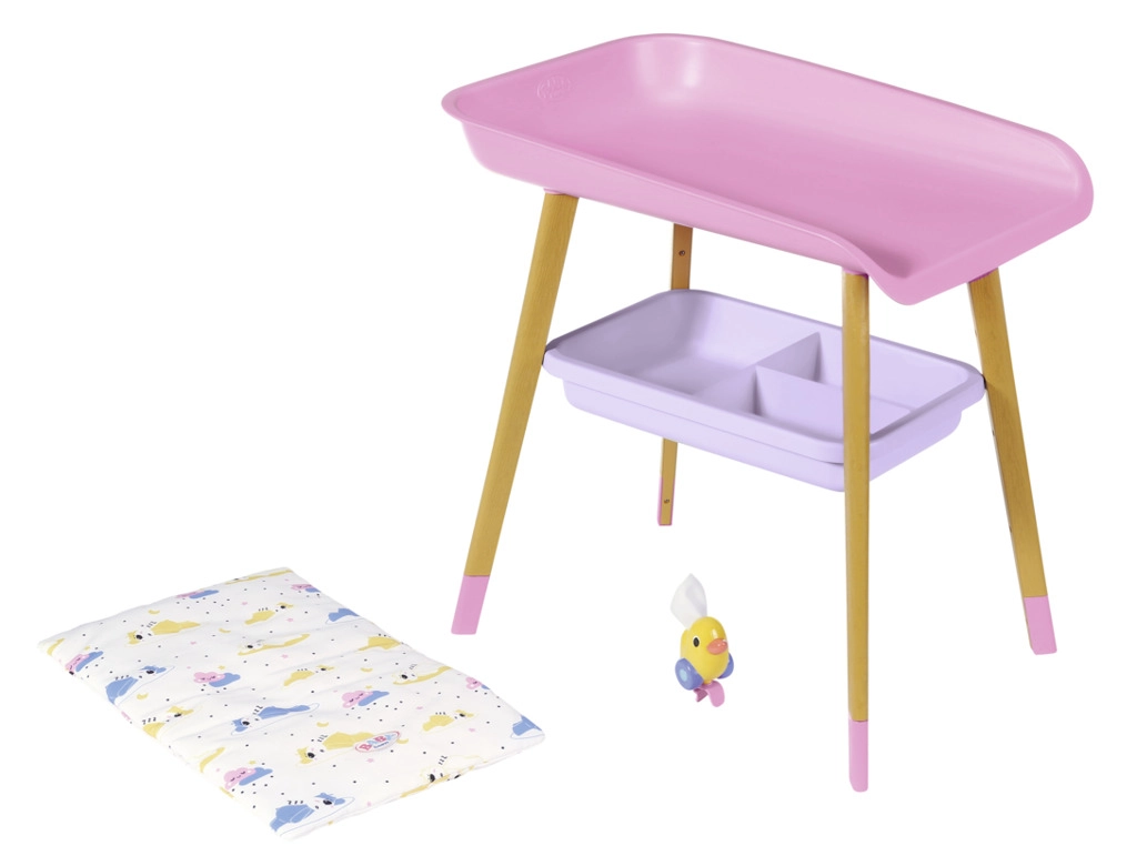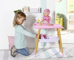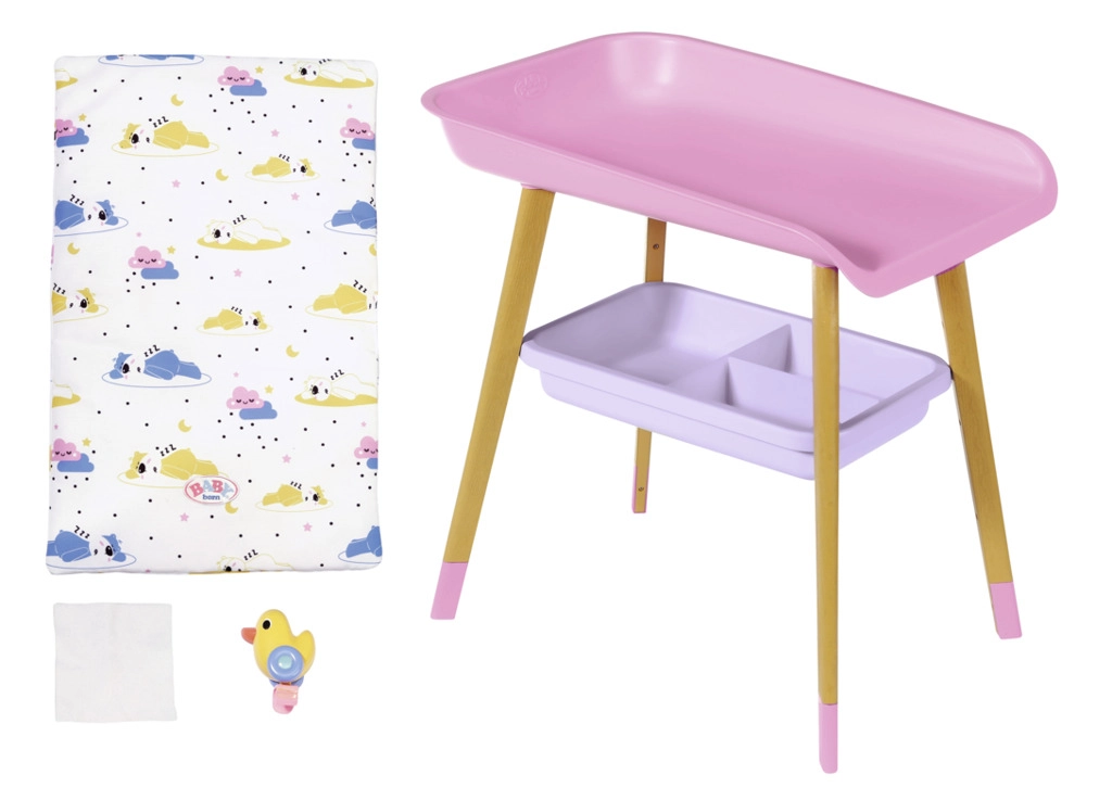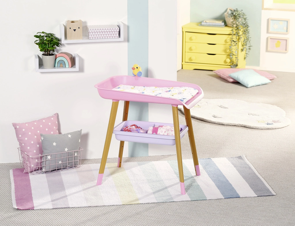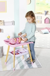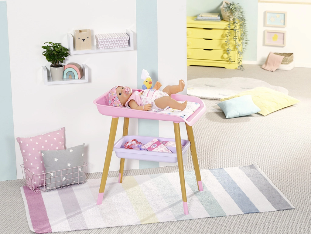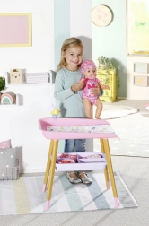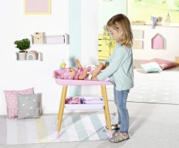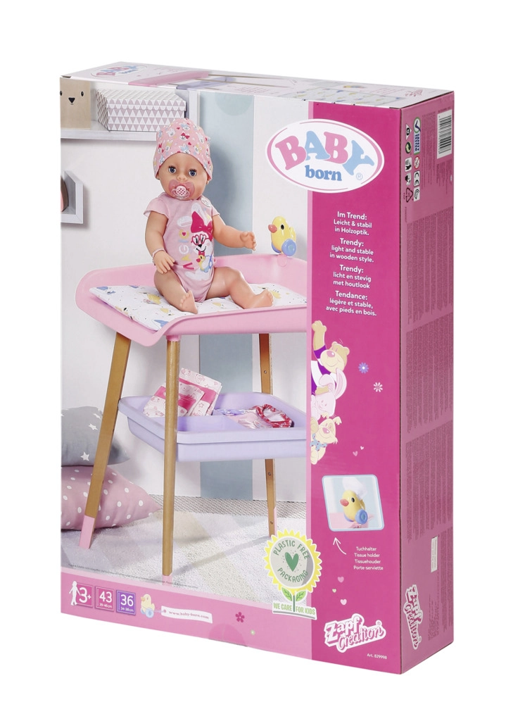 A stílusos BABY born pelenkázóasztal valósághű gondoskodós játékot kínál a gyerekeknek. Fautánzatú lábakkal, puha pelenkázó alátéttel, levehető törlőkendő-adagolóval kiskacsával és praktikus rekeszekkel a pelenkák, ruhácskák és kiegészítők számára. Tökéletesen illik a gyerekszobába, és harmonizál más BABY born kiegészítőkkel.