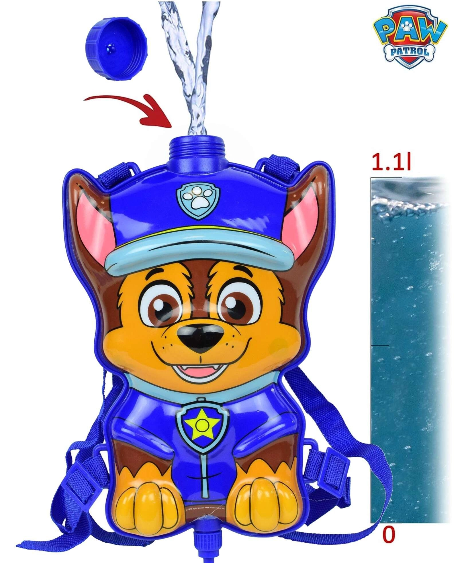 Szórakoztató vízestáska a Mancs őrjárat sorozat Chase figurájával, végtelen nyári mókához. A hátizsákon állítható pántok, zárható töltőnyílás található, és csővel össze van kötve egy kézi pumpás vízipisztollyal. Ideális a kertbe, vízpartra és játszótérre.