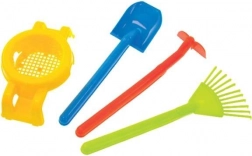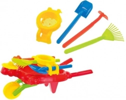 A nagy, forgó kerék sima és stabil haladást biztosít különböző felületeken, míg a kettős támasz lehetővé teszi a talicska biztonságos lehelyezését. Az ergonomikus fogantyúk a gyerektenyérhez illeszkednek és biztos fogást nyújtanak. A csomagban hasznos kiegészítők találhatók: gereblye, lapát, kapa és szita – ideális föld hordásához, lombgyűjtéshez vagy a homok szitálásához.