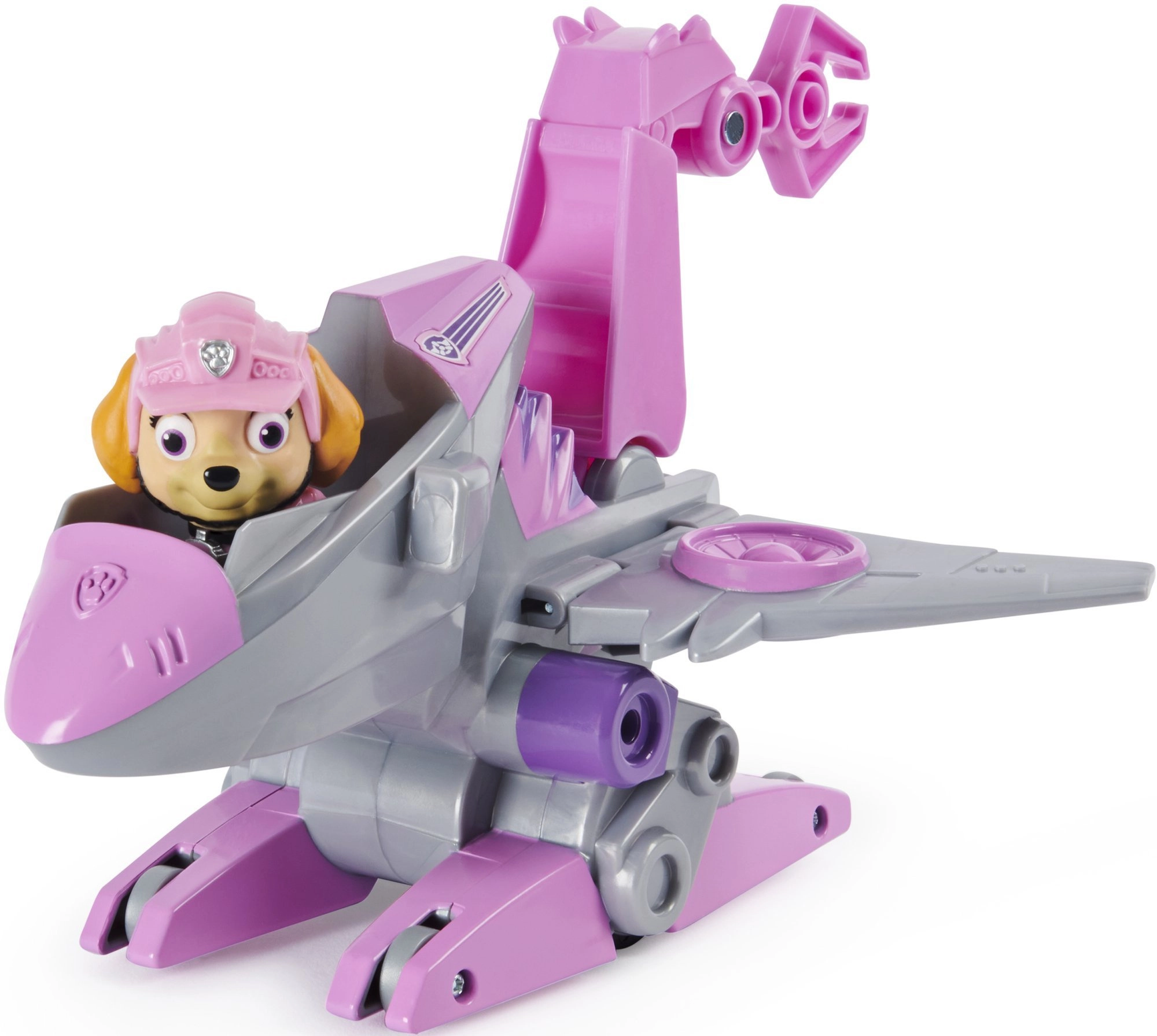 Skye figurája részletgazdag kidolgozású, rózsaszín sapkát és jetpacket visel, mozgatható elemei megkönnyítik a pózolást és a játékot. A jármű a figurához igazodik, így a gyerekek azonnal elindulhatnak a dino mentő küldetésekre.