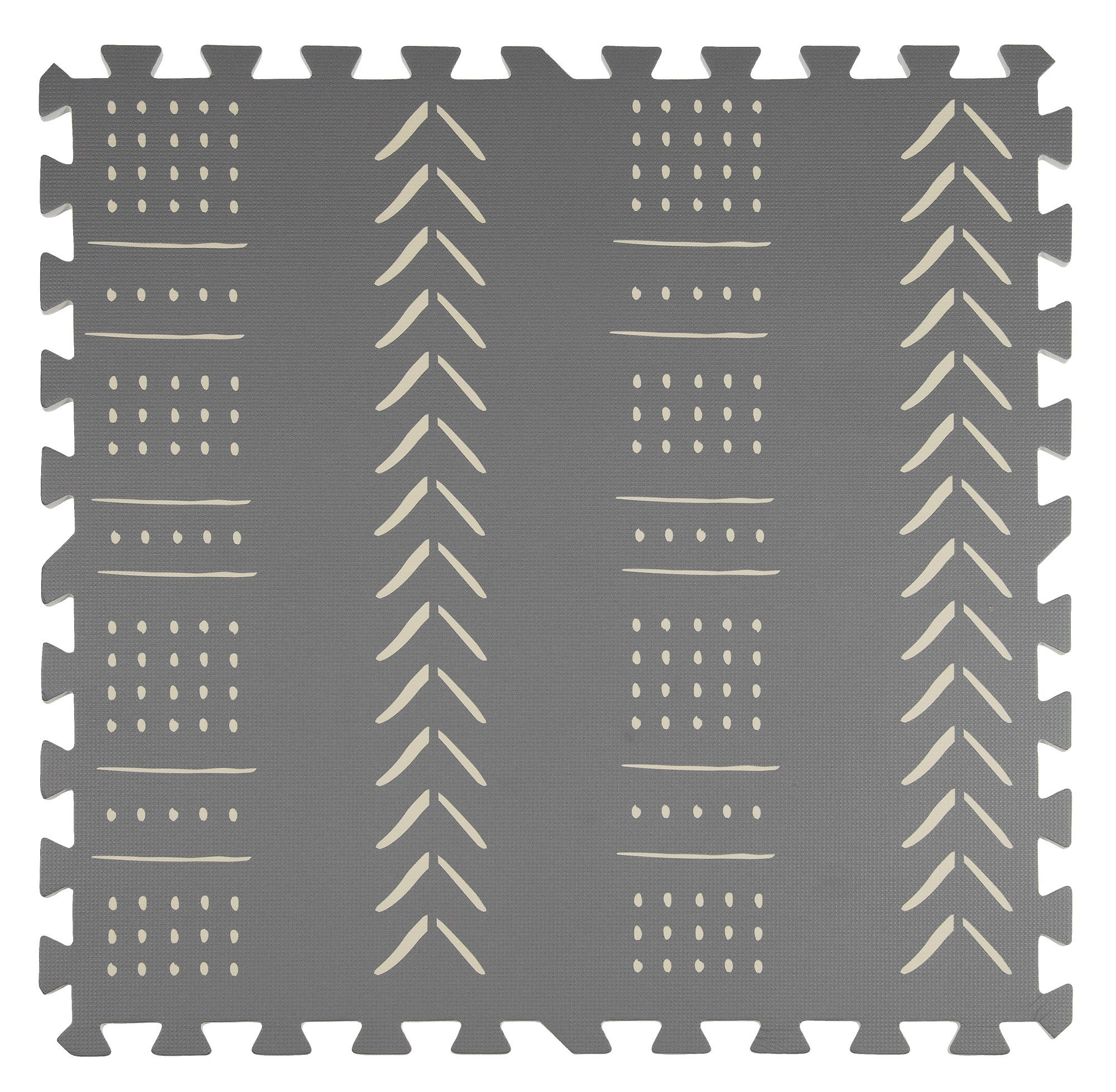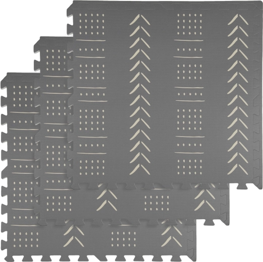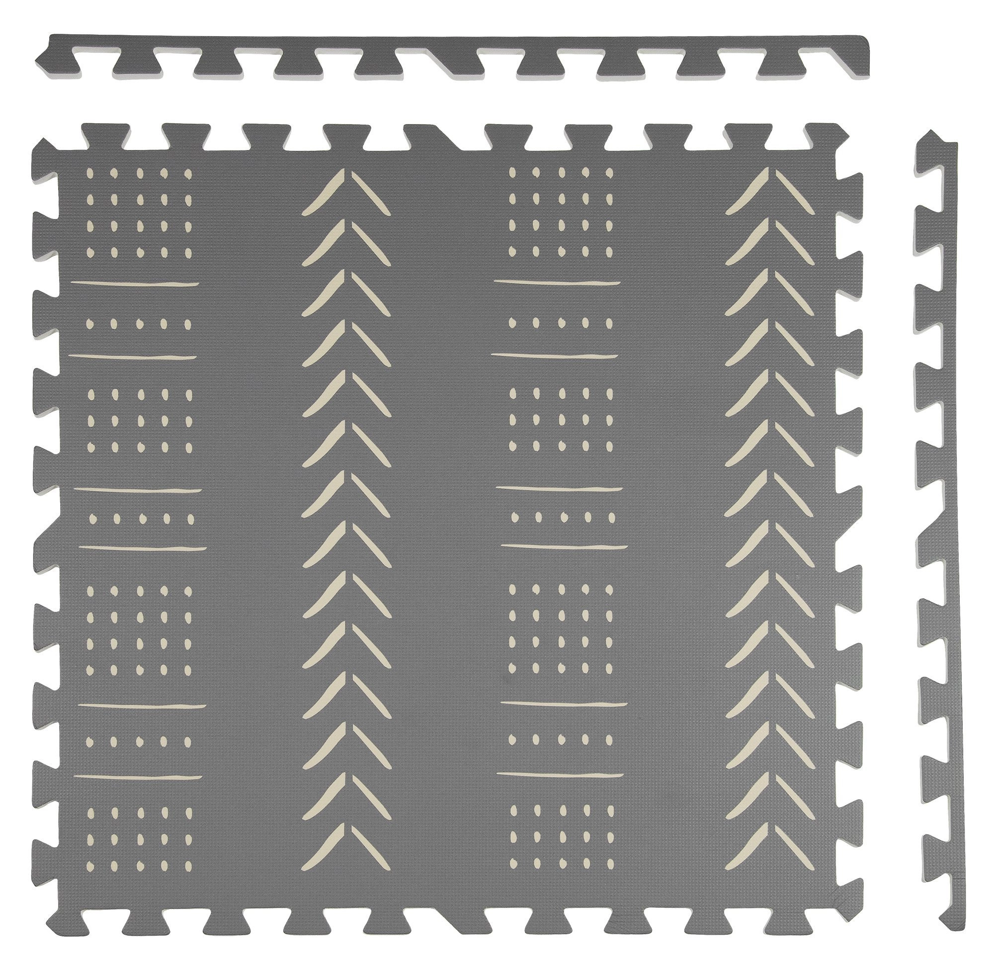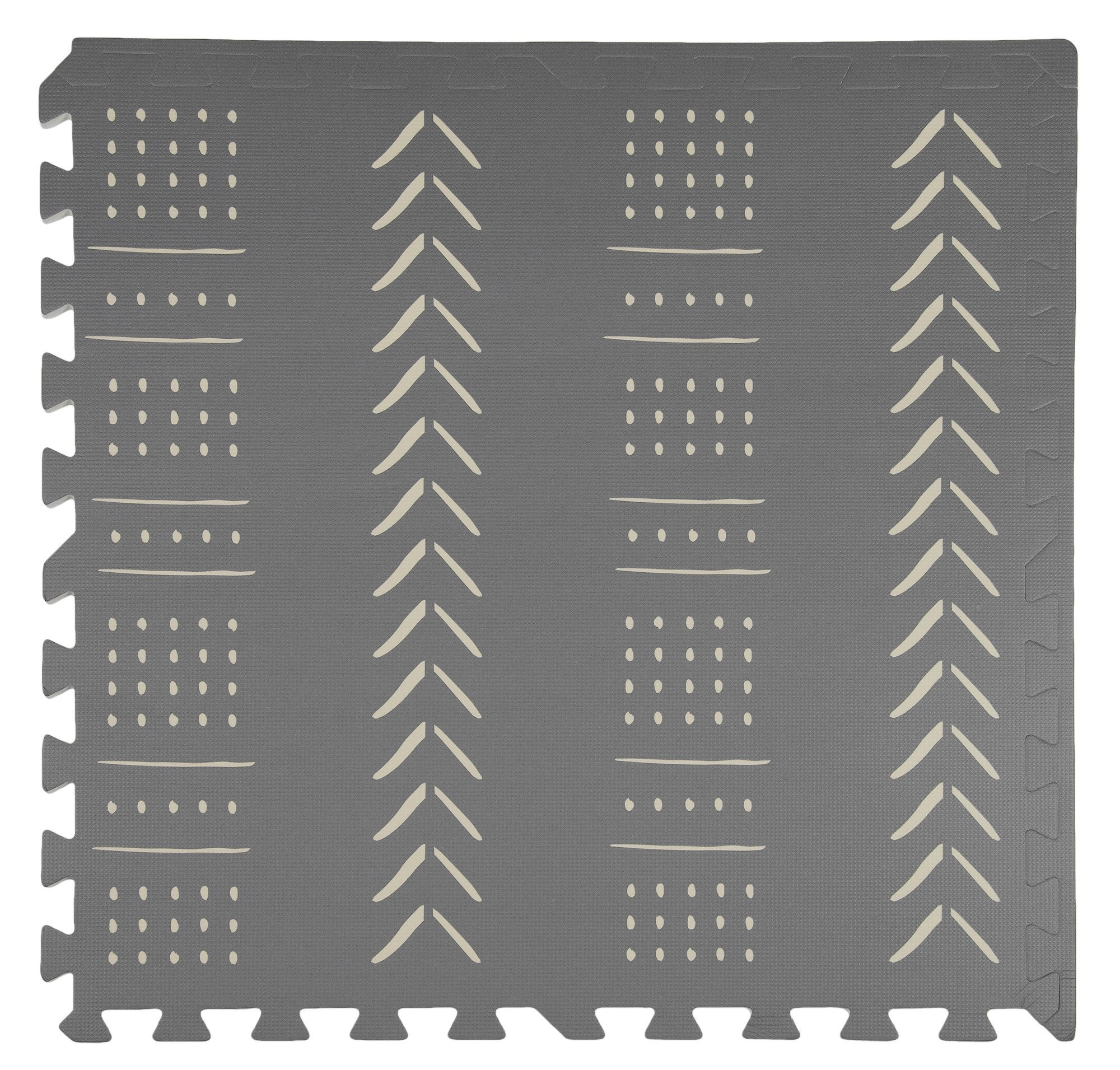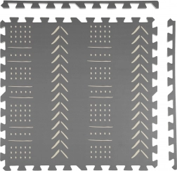 A stílusos és praktikus HUMBI gyerek habszivacs szőnyeg 3 nagy, 60 × 60 cm-es elemből és 6 szegélyből áll. Puha felületet kínál játékhoz, kiváló hőszigetelést a hideg ellen, vízálló, csúszásgátló és könnyen tisztítható. Nem tartalmaz káros anyagokat, és megfelel az EN 71 és a REACH szabványoknak. Visszafogott szürke boho mintái remekül illenek bármelyik enteriőrbe.