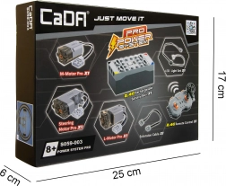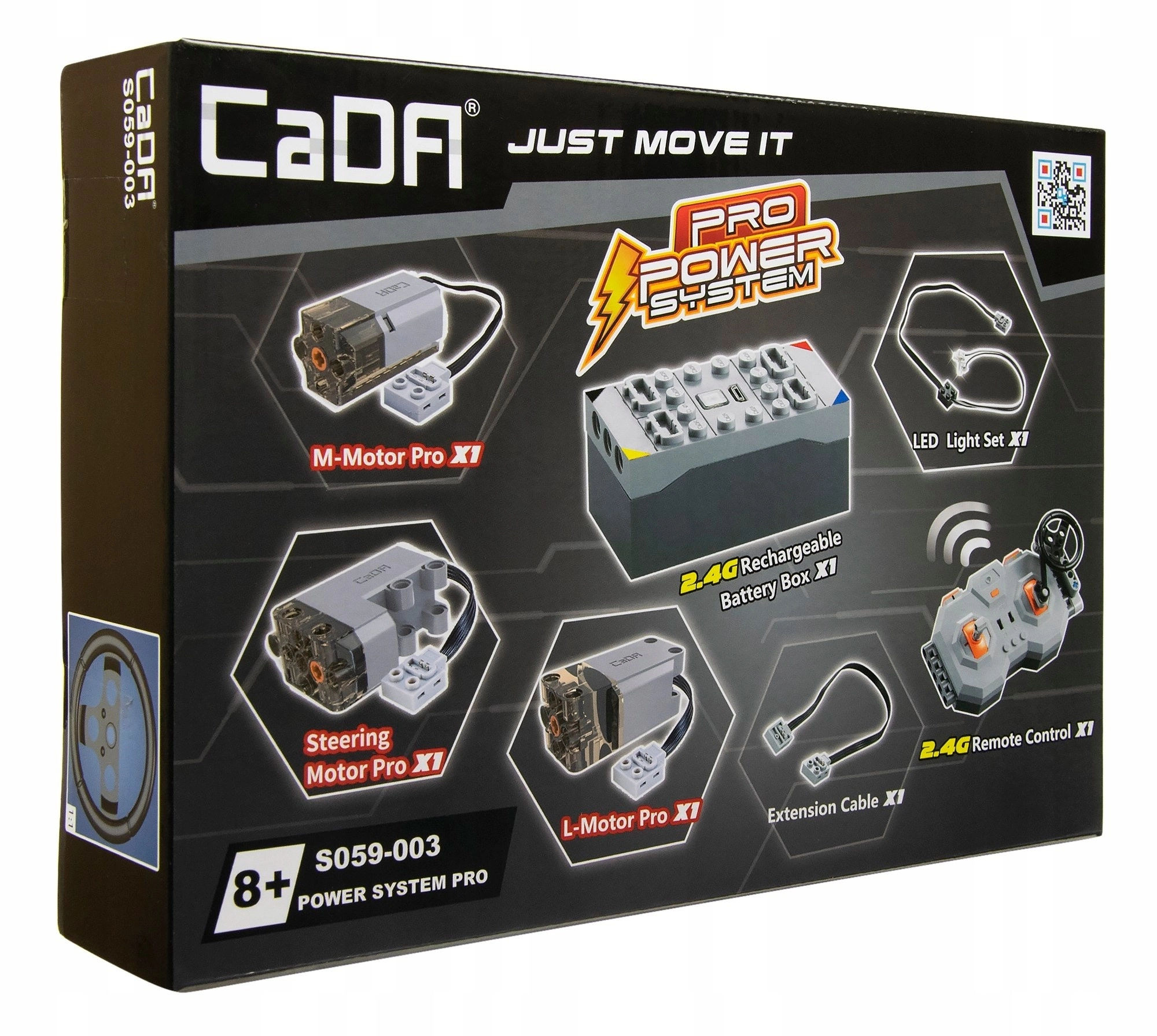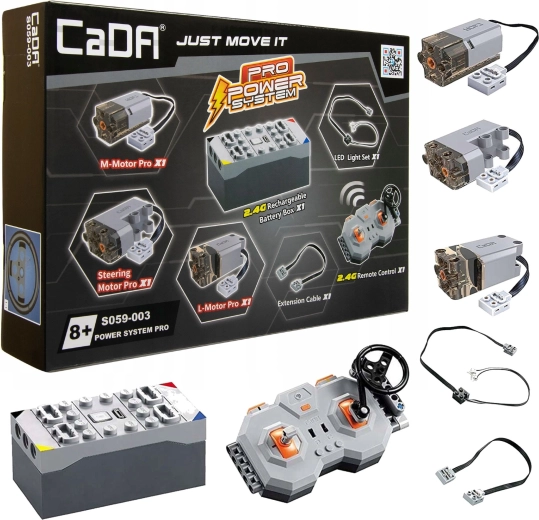A Pro Power System készlet valódi hajtást és irányíthatóságot ad CaDA építményeinek. A motorok, szervókormány, akkumulátor és 2,4 GHz-es távirányító kombinációjával előre és hátra haladhat, kormányozhat, be-/kikapcsolhatja a LED lámpákat, és egyes modelleknél ajtókat nyithat vagy zárhat. Ideális építőknek, akik a statikus modelleket teljesen funkcionális RC járművekké szeretnék alakítani.