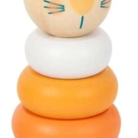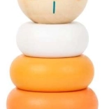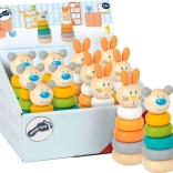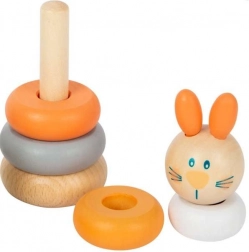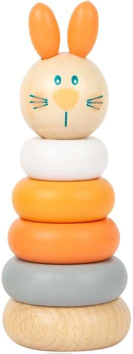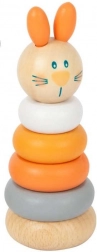 A különböző színű és méretű karikáknak köszönhetően a gyerekek játékosan tanulnak válogatni és helyes sorrendbe rakni, a nyuszi fejével megkoronázva az építményt.