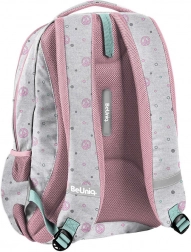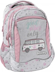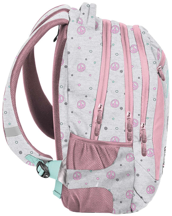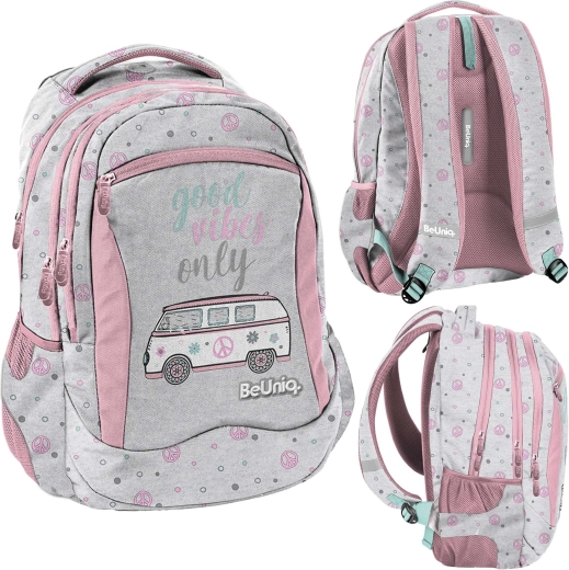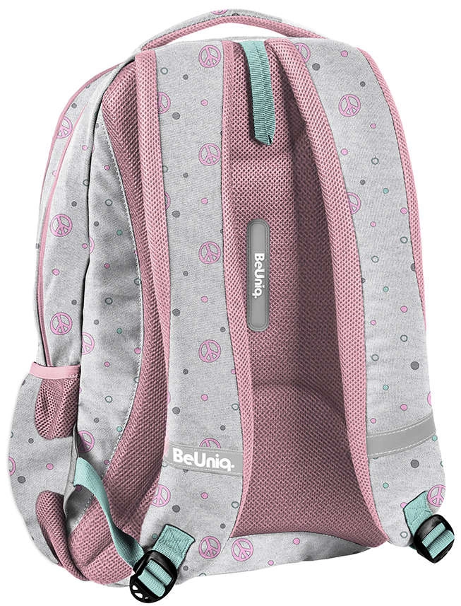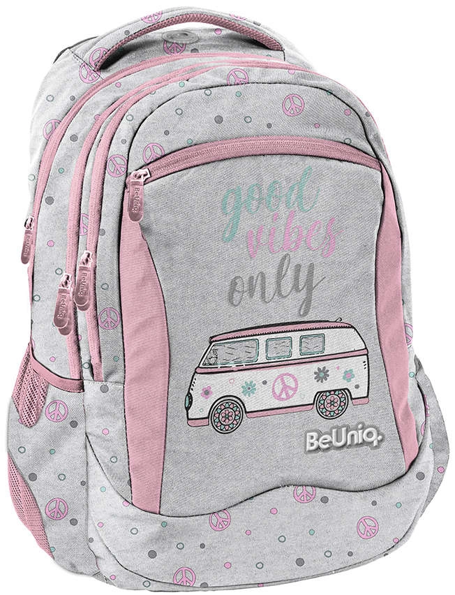 Stílusos BeUniq Good Vibes Only iskolatáska a Paso márkától szürke–rózsaszín kivitelben, 3 tágas rekesszel, elülső cipzáras zsebbel és oldalsó hálós zsebekkel palacknak. Párnázott, ergonomikus hátkialakítás, kényelmes, állítható vállpántok, légáteresztő hátpanel, valamint fényvisszaverő elemek a biztonságért. Tartós anyag és minőségi cipzárak a hosszú élettartamért és a mindennapi kényelemért.