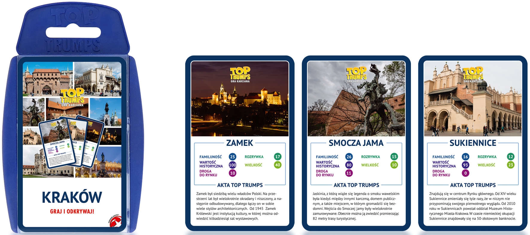 A Krakkó kiadás tematikus kártyákat kínál látnivalókkal és érdekességekkel, amelyek különleges hangulatot adnak a játéknak. A praktikus műanyag toknak köszönhetően bárhová magával viheti – kirándulásra, nyaralásra vagy látogatásra.