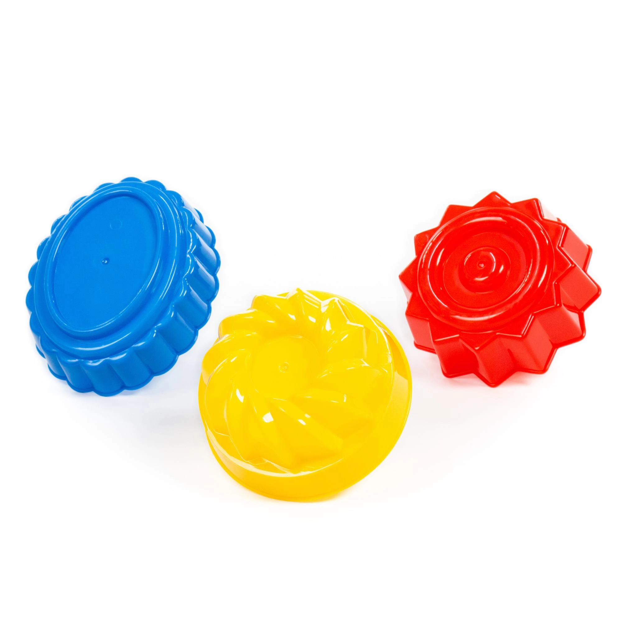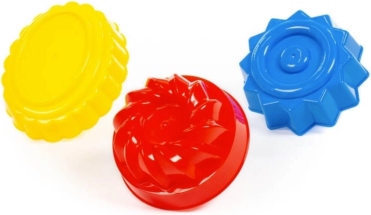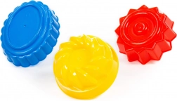 A három különböző sütiforma lehetővé teszi a gyerekeknek, hogy változatos és dekoratív alakzatokat készítsenek homokból vagy gyurmából.