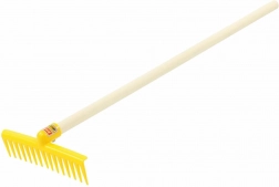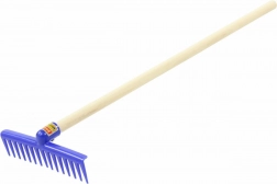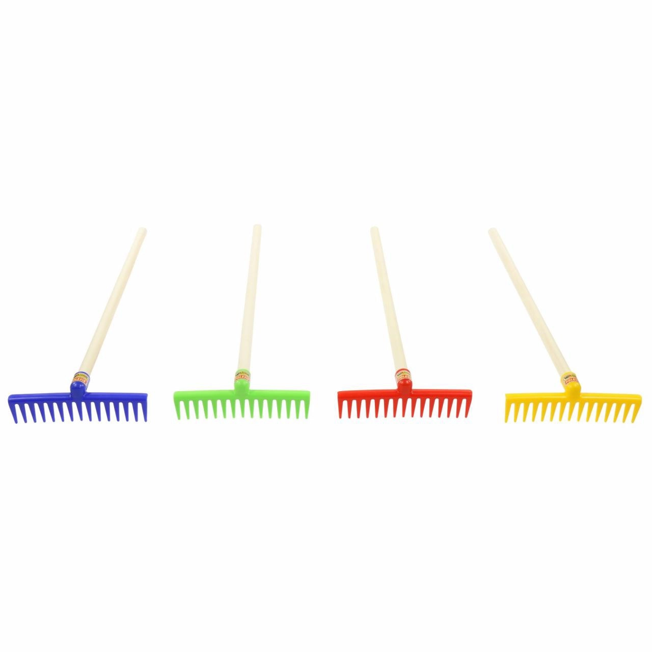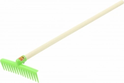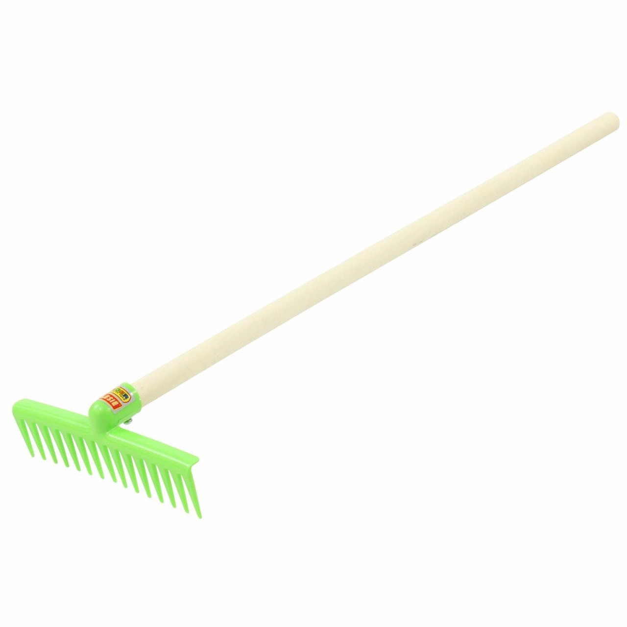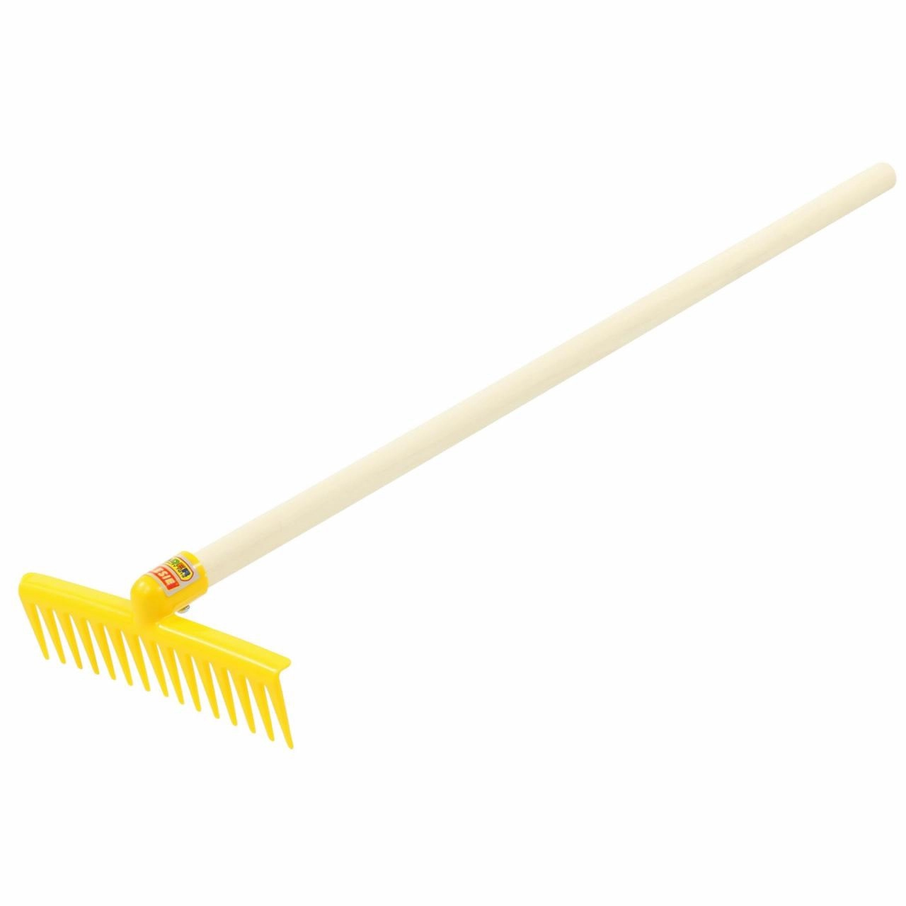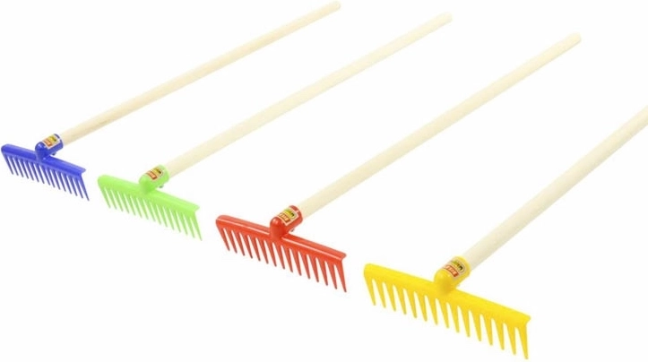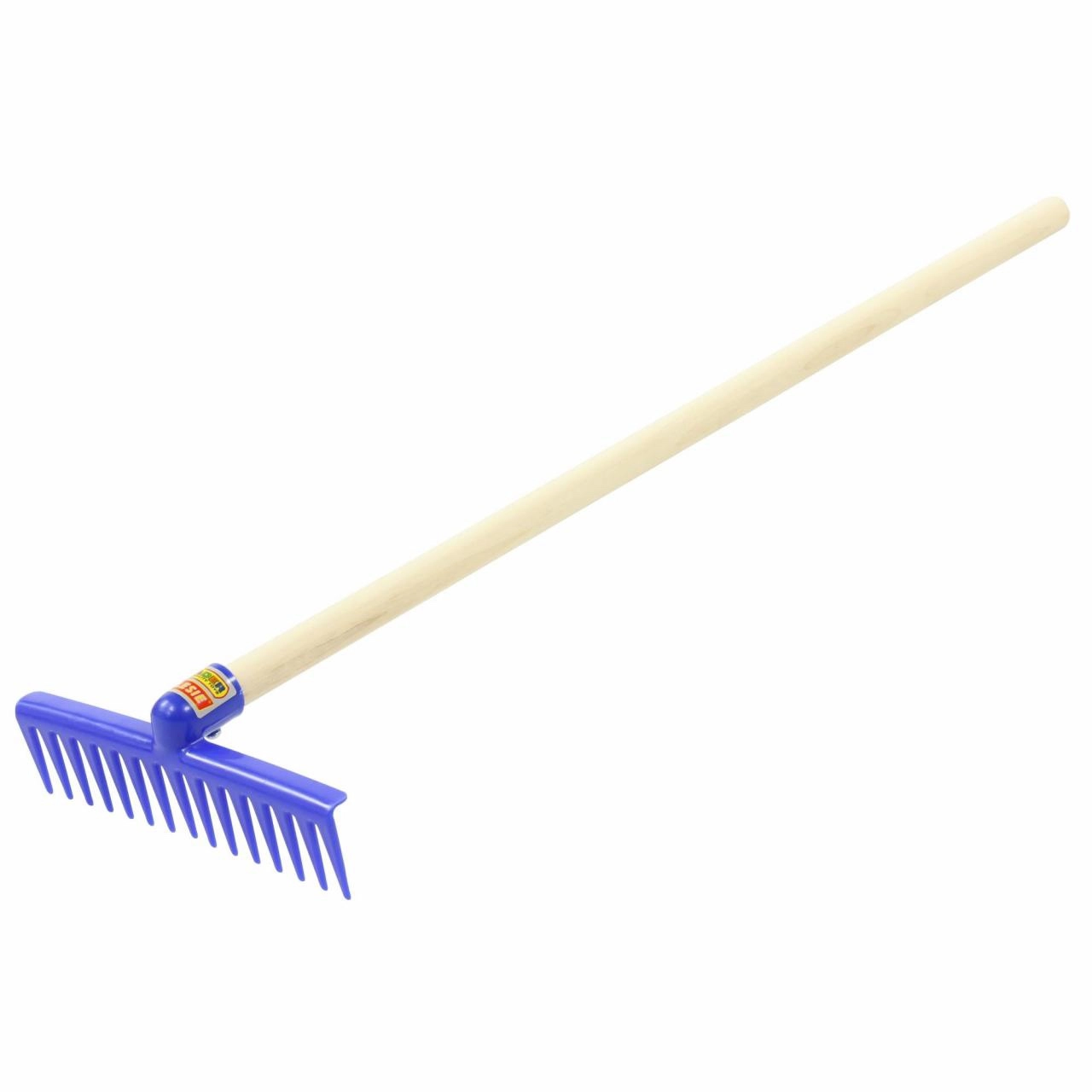 A fa nyél és a műanyag fej kiegyensúlyozott, könnyű eszközt alkot, amellyel a gyerekek játék közben és könnyű gereblyézésnél is jól boldogulnak.