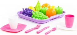 Szórakoztató gyermekkonyhai készlet színes gyümölcsökkel, tányérokkal, poharakkal, evőeszközökkel és tálcával – remek lehetőség főzős és tálalós szerepjátékhoz. Támogatja a képzelet fejlesztését, a finommotorikát és az ismerkedést a gyümölcsökkel. A csomag része egy nagy, kb. 13 cm-es szőlőfürt és egy 28 × 28 cm-es tálca is. A színösszeállítás az aktuális raktárkészlettől függően eltérhet.