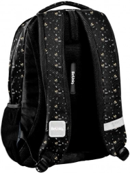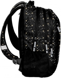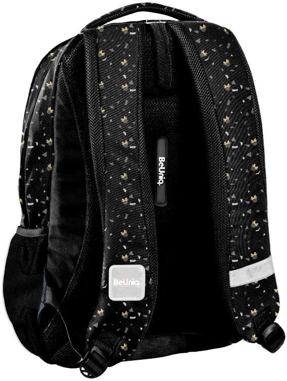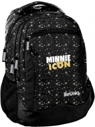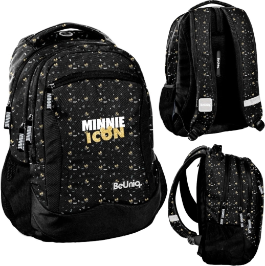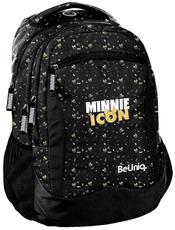 A Paso márka BeUniq MINNIE Icon könnyű és tartós iskolai hátizsákja elegáns fekete–arany kivitelben három tágas rekesszel, elülső cipzáras zsebbel és két oldalsó hálós zsebbel rendelkezik. Párnázott, ergonomikus vállpántokkal, megerősített, formázott hátpanellel és légáteresztő hálóval, valamint fényvisszaverő elemekkel a biztonságért. A minőségi, vízálló poliészternek és az alacsony tömegnek köszönhetően ideális a mindennapi iskolába járáshoz és szabadidőhöz.