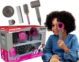 A CASDON gyerek fodrász szett az ikonikus Dyson Supersonic hajszárítóval autentikus szalonélményt nyújt. A játék levegőt fúj, fényhatásokkal rendelkezik, és a mágneses/cserélhető tartozékoknak köszönhetően változtatható a szárítási stílus. A mellékelt körkefe és széles fésű támogatja a fantáziát frizurák készítésekor gyerekeknek, babáknak és barátoknak.